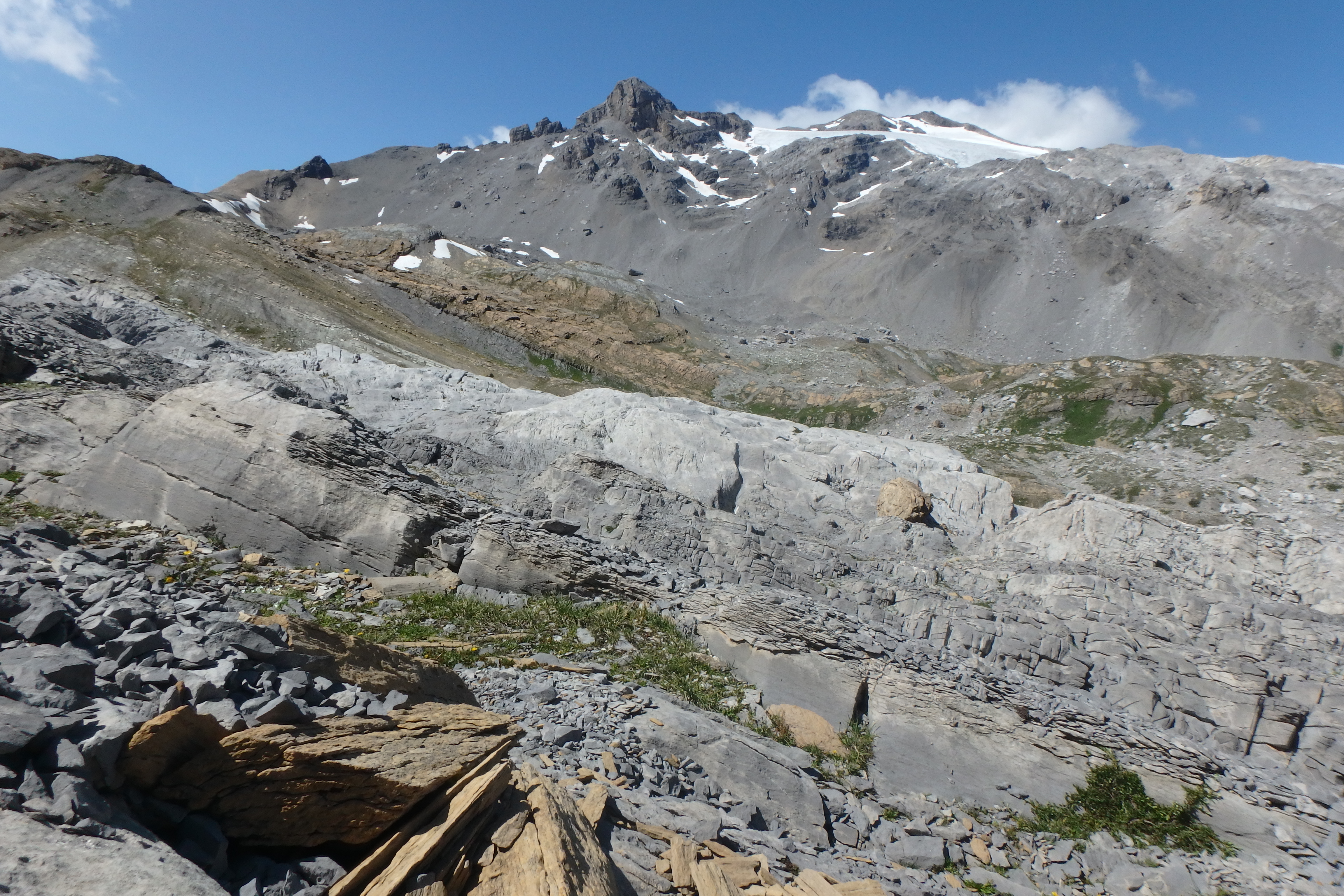 The orange rock in the background is the source of the orange rock in the foreground. Glacier du Wildhorn can also be seen high in the mountain top. Glacier du Wildhorn, Switzerland.