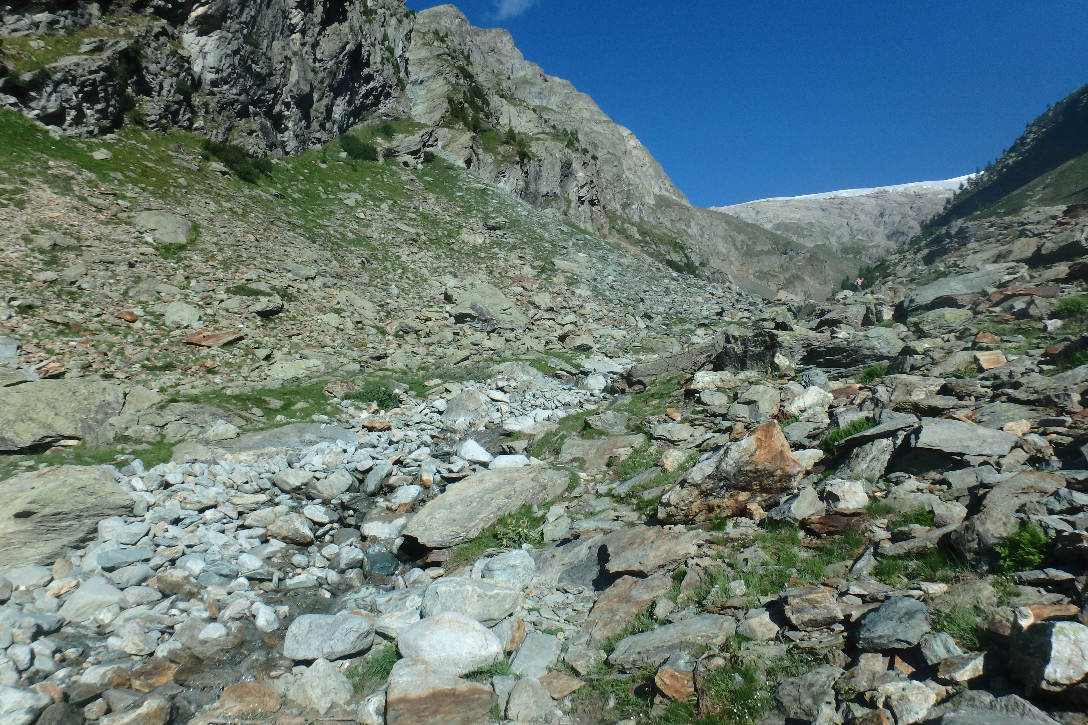 A mountrain stream and rubble field in front of the Usser Tal Glacier and forefield. Usser Tal Glacier, Switzerland.