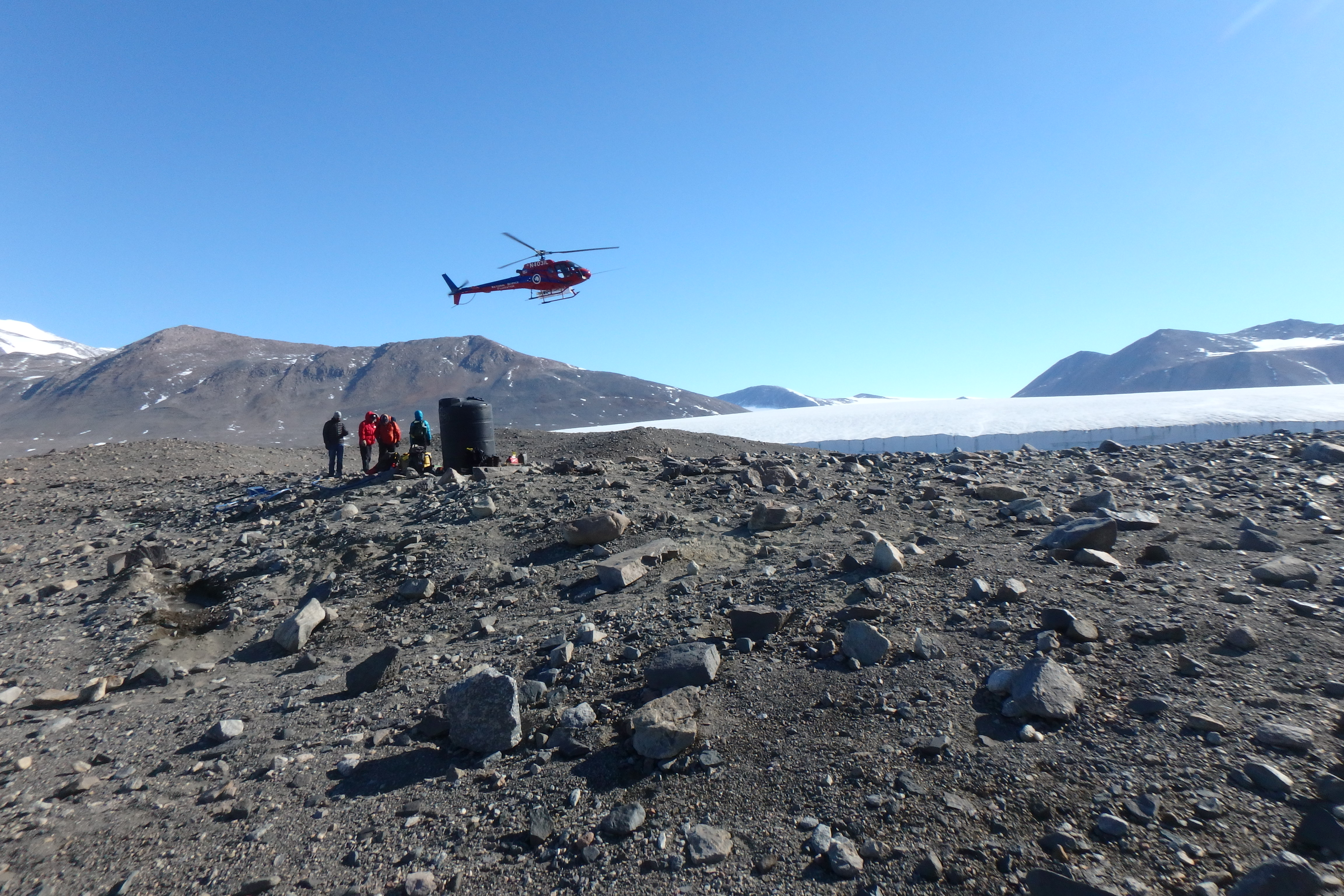 This A-Star helicopter was used to transport the team and the supplies needed to conduct the experiments. Many Glaciers Pond, McMurdo Dry Valleys, Antarctica.