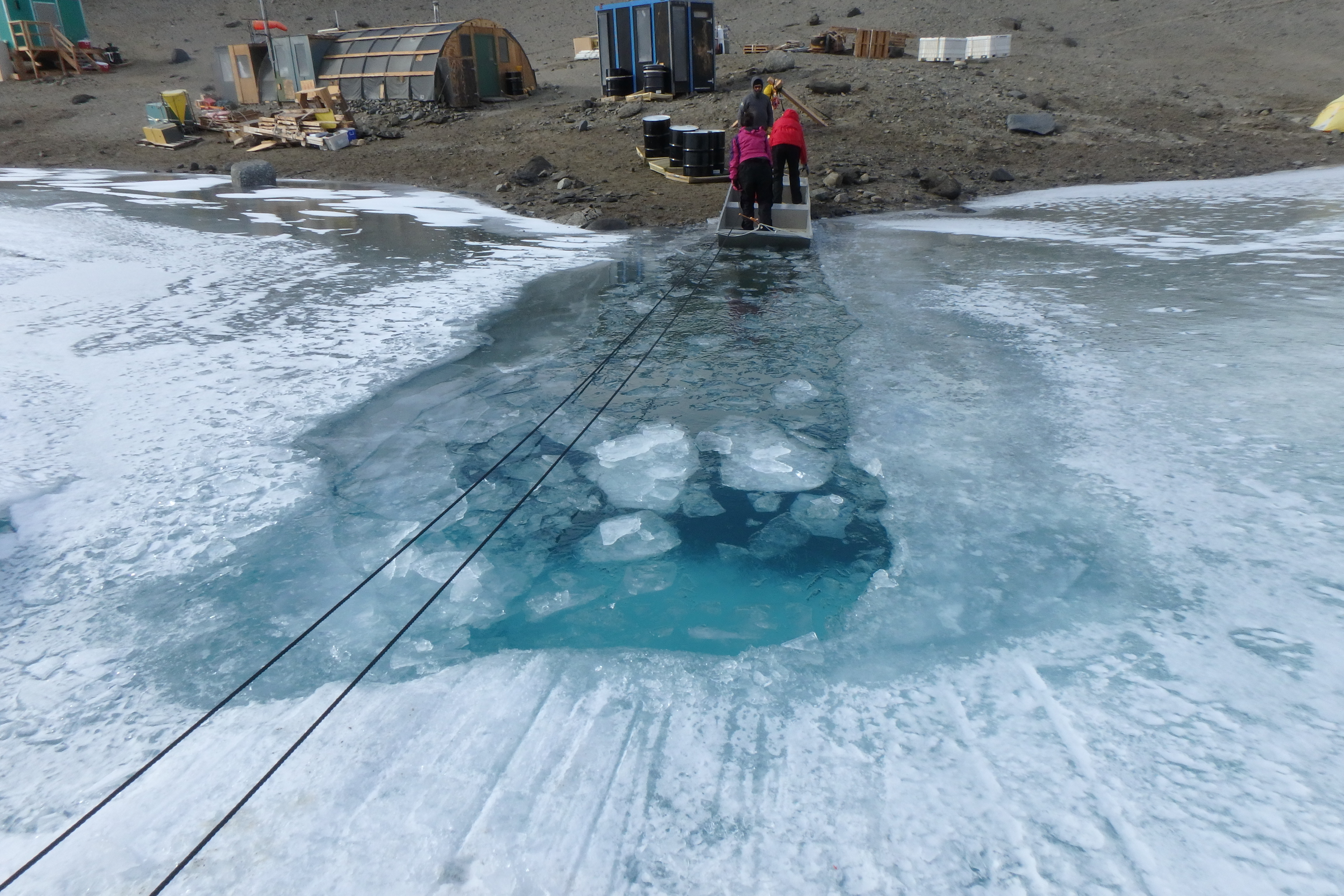 A moat is the area between the very thick lake ice and the very thin ice along the shore's edge. The team uses "moat boats" to cross this dangerously thin ice. Lake Bonney, Antarctica.