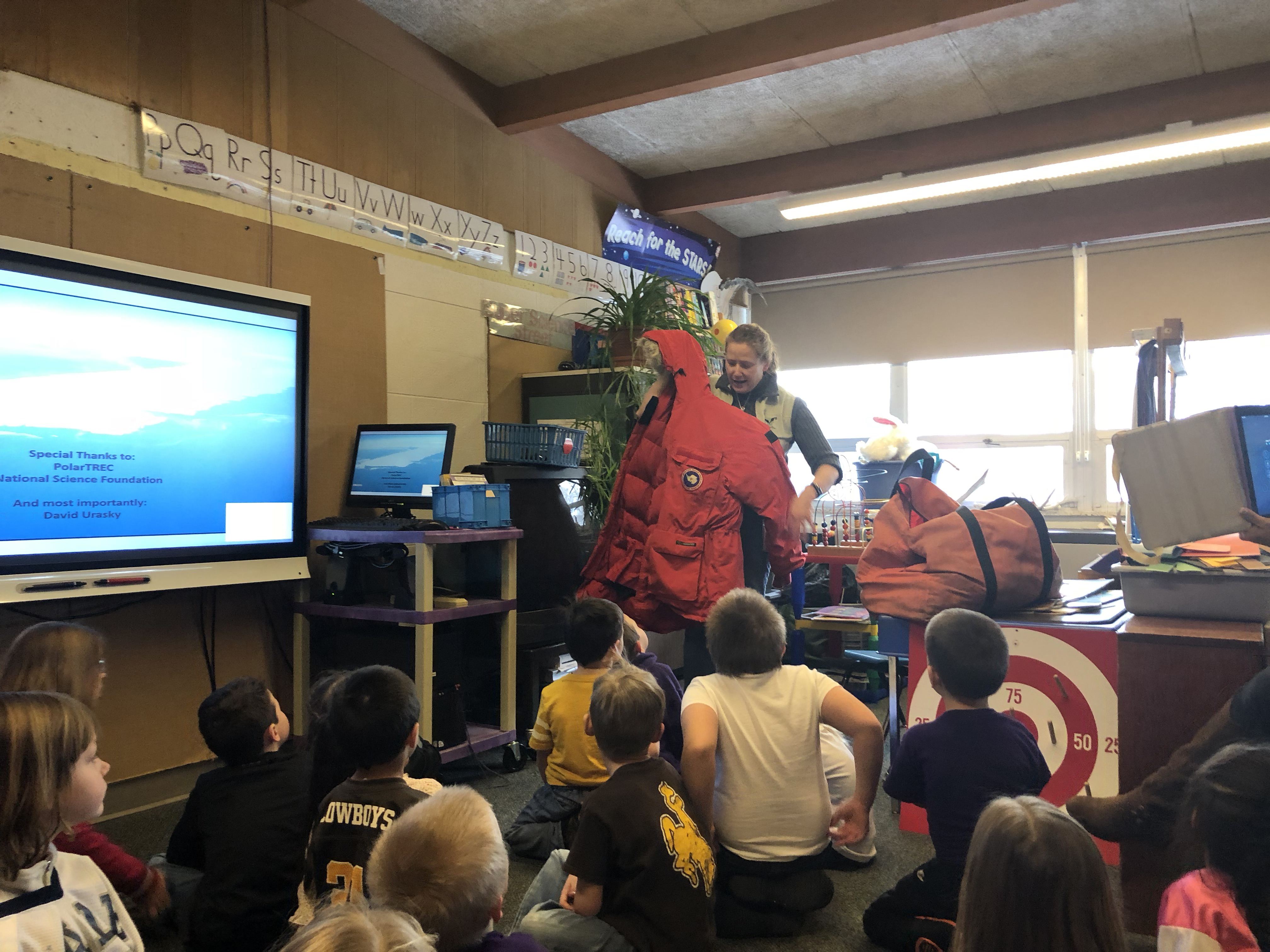PolarTREC alumna and educator Lesley Urasky presents to a kindergarten class at Saratoga Elementary School in Saratoga, Wyoming.