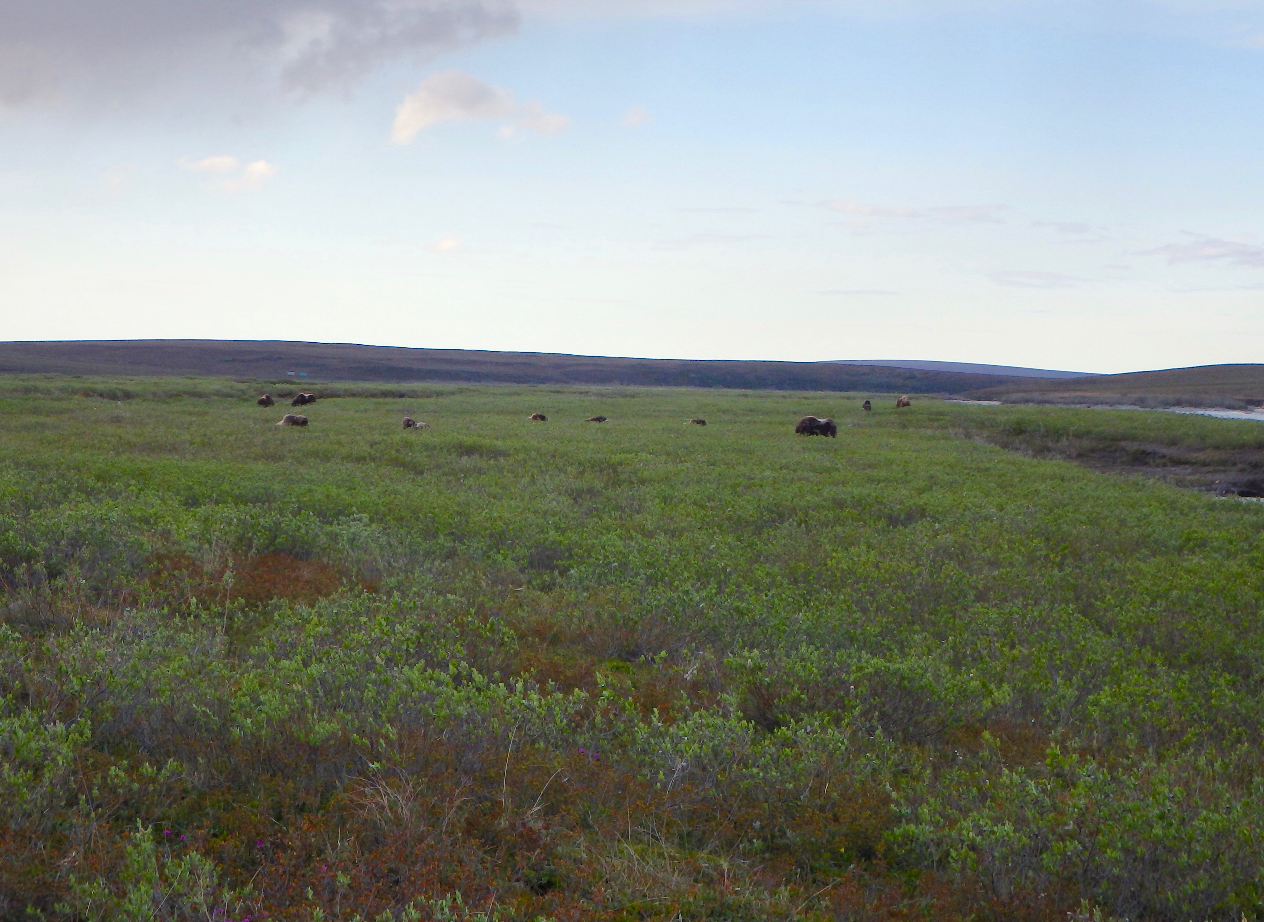 A muskox herd feeds near the Trans-Alaska Pipeline pump station 3. North Slope, Alaska.