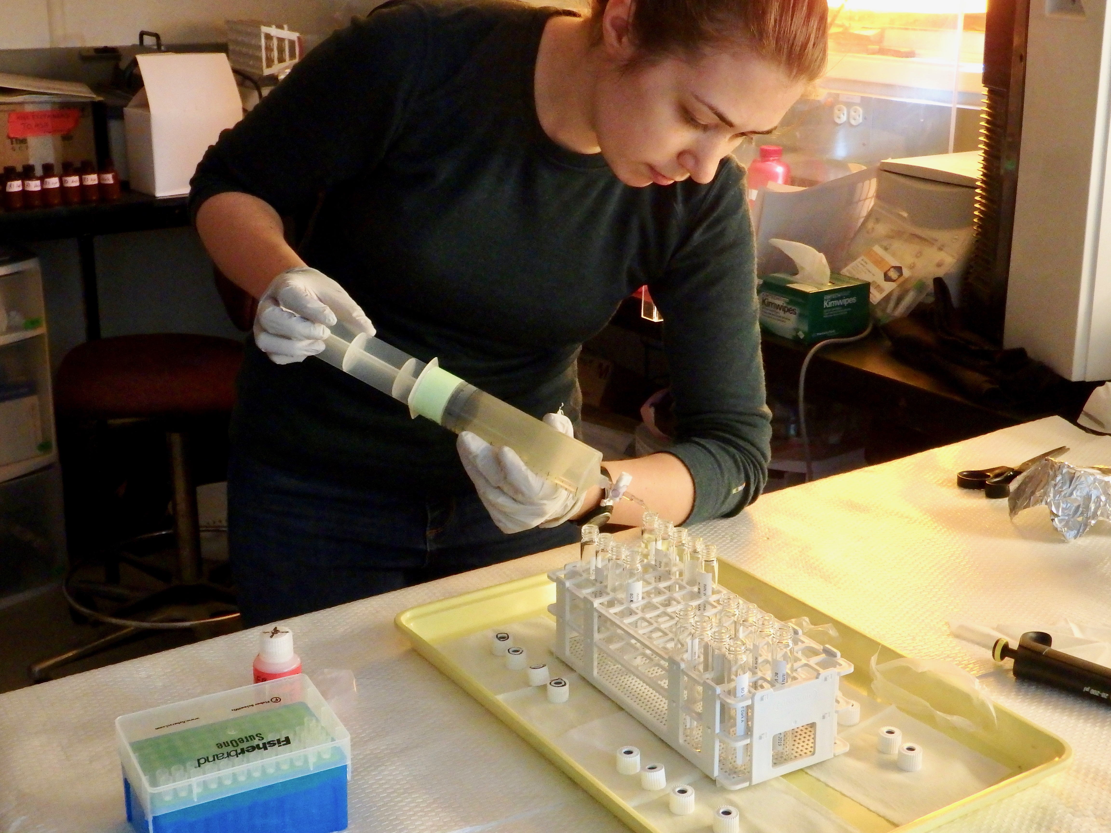 Research technician Katie Polik transfers inoculated permafrost leachate sample to gas-tight tubes. Toolik Field Station, Alaska.