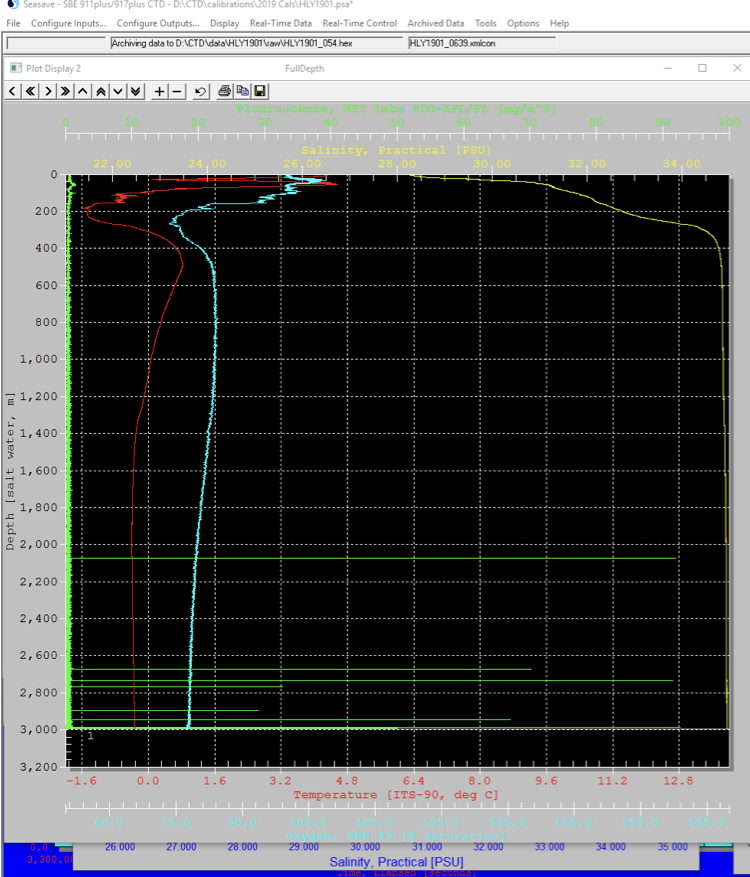 A graph of the deep cast CTD (conductivity, temperature, and depth) instrument showing how temperature, salinity, and fluorescence change at different depths. Aboard the USCGC Healy icebreaker in the Arctic Ocean.