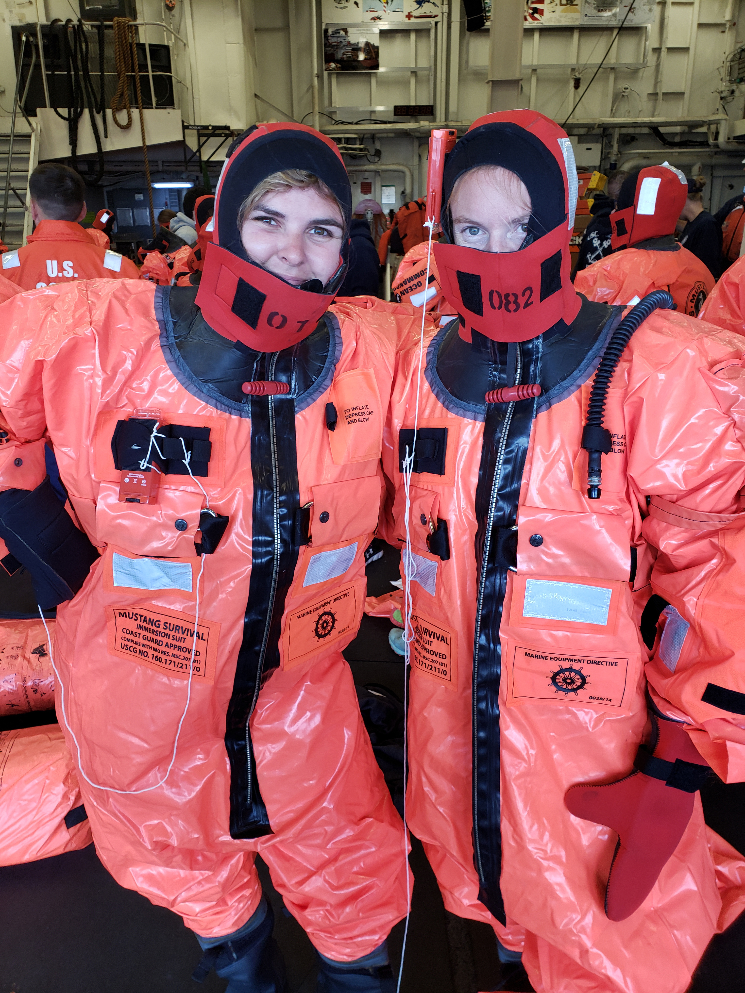 Piper Bartlett-Browne and Nicole Villeneuve wear "gumby" mustang survival immersion suits. Aboard the USCGC Healy icebreaker in the Arctic Ocean.