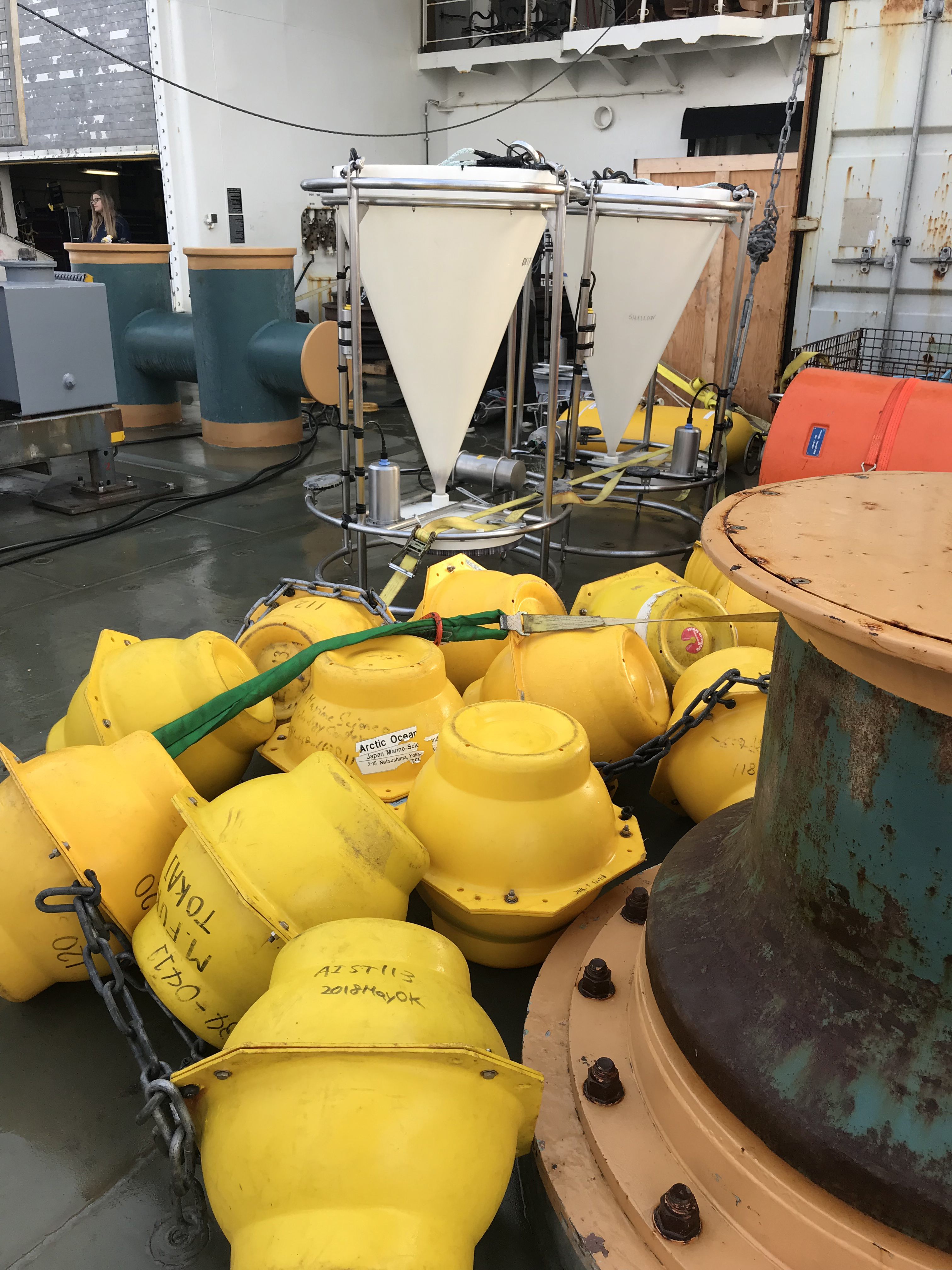 A sediment trap with buoys on the back deck of the USCGC Healy icebreaker in the Beaufort Sea.