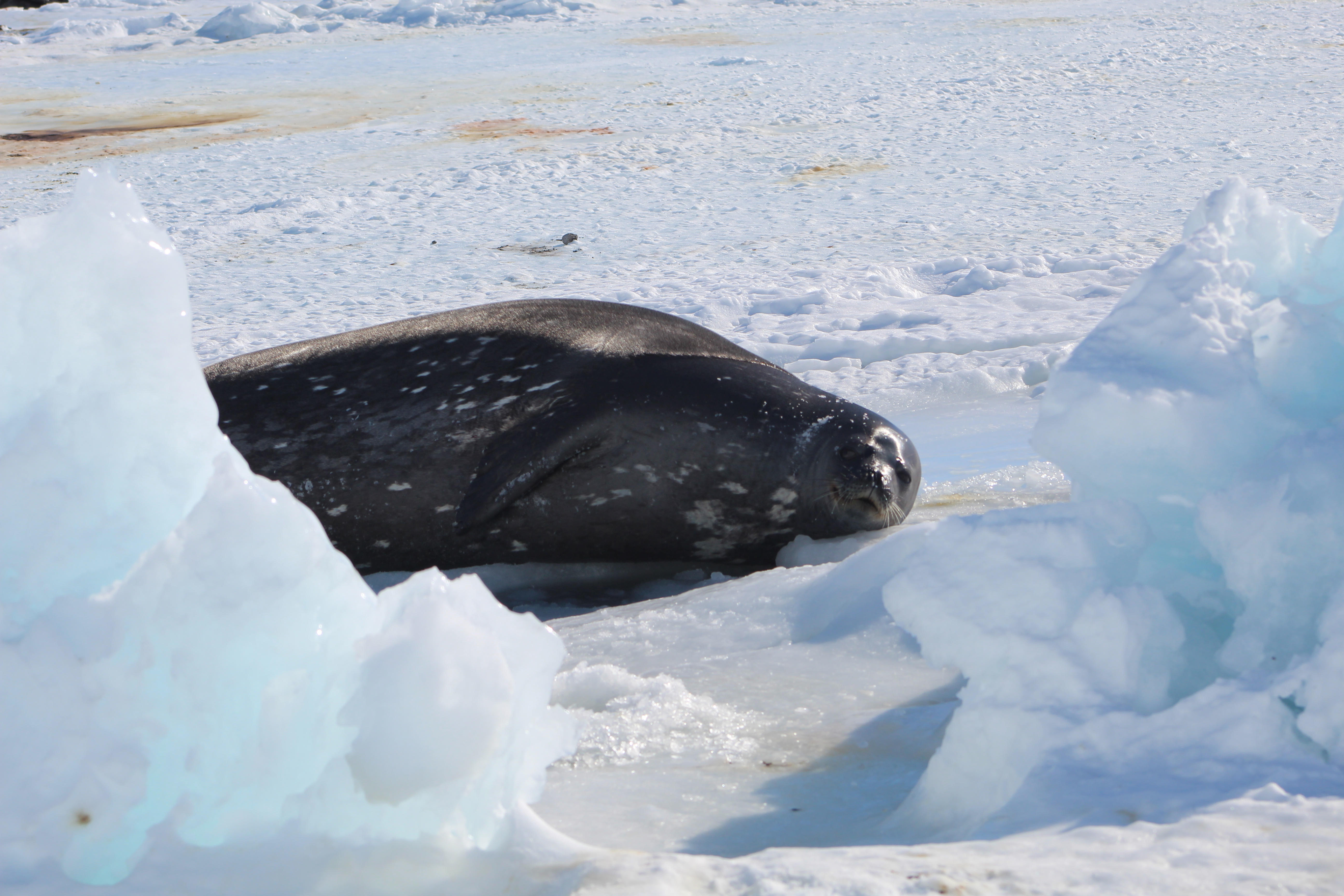 An adult Weddell seal cools off in a melt pool. Hutton Cliffs, Antarctica.