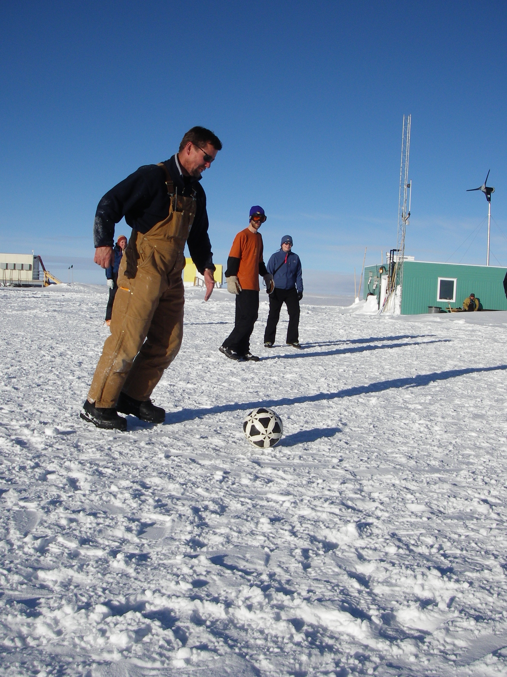 Chris the Medic of the Ye Old Pirates team, kicks the soccer ball toward the Snow Bunnies goal. The Yard, Summit Camp, Greenland.