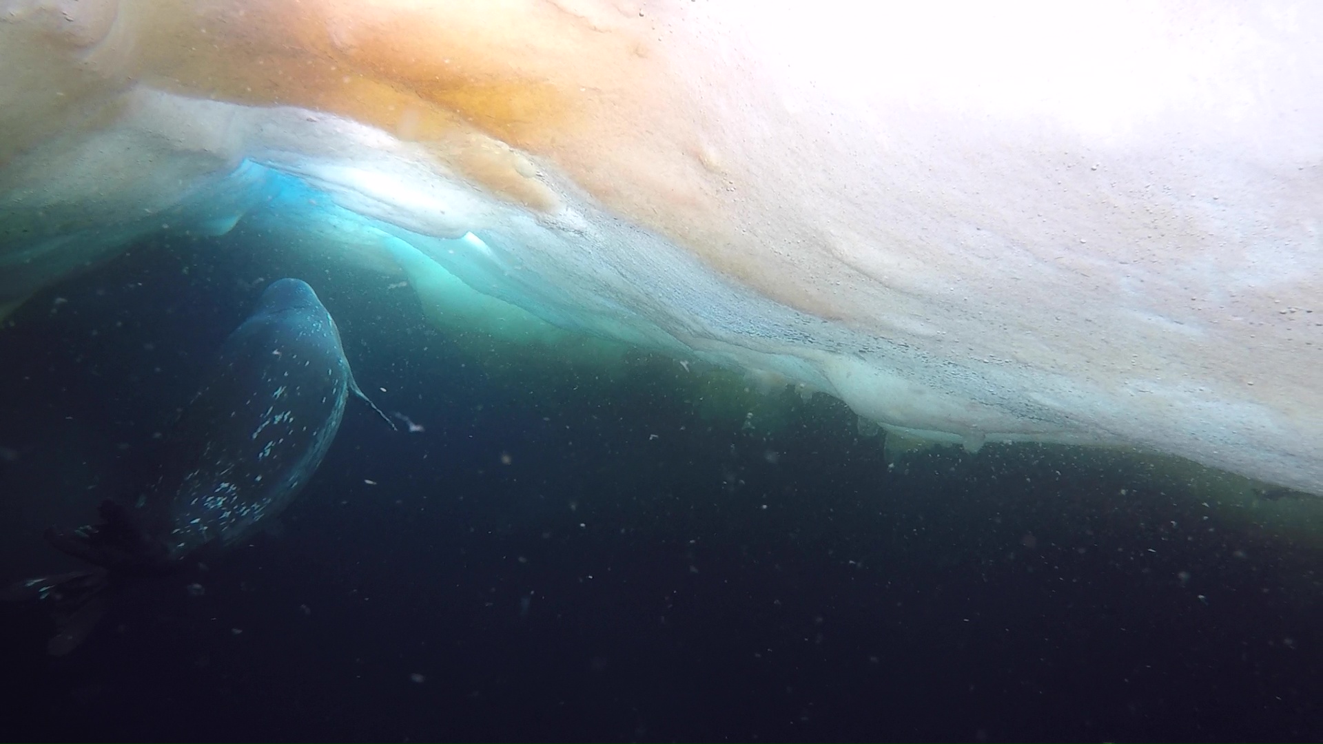 A Weddell seal swims under the ice near McMurdo Station, Antarctica.