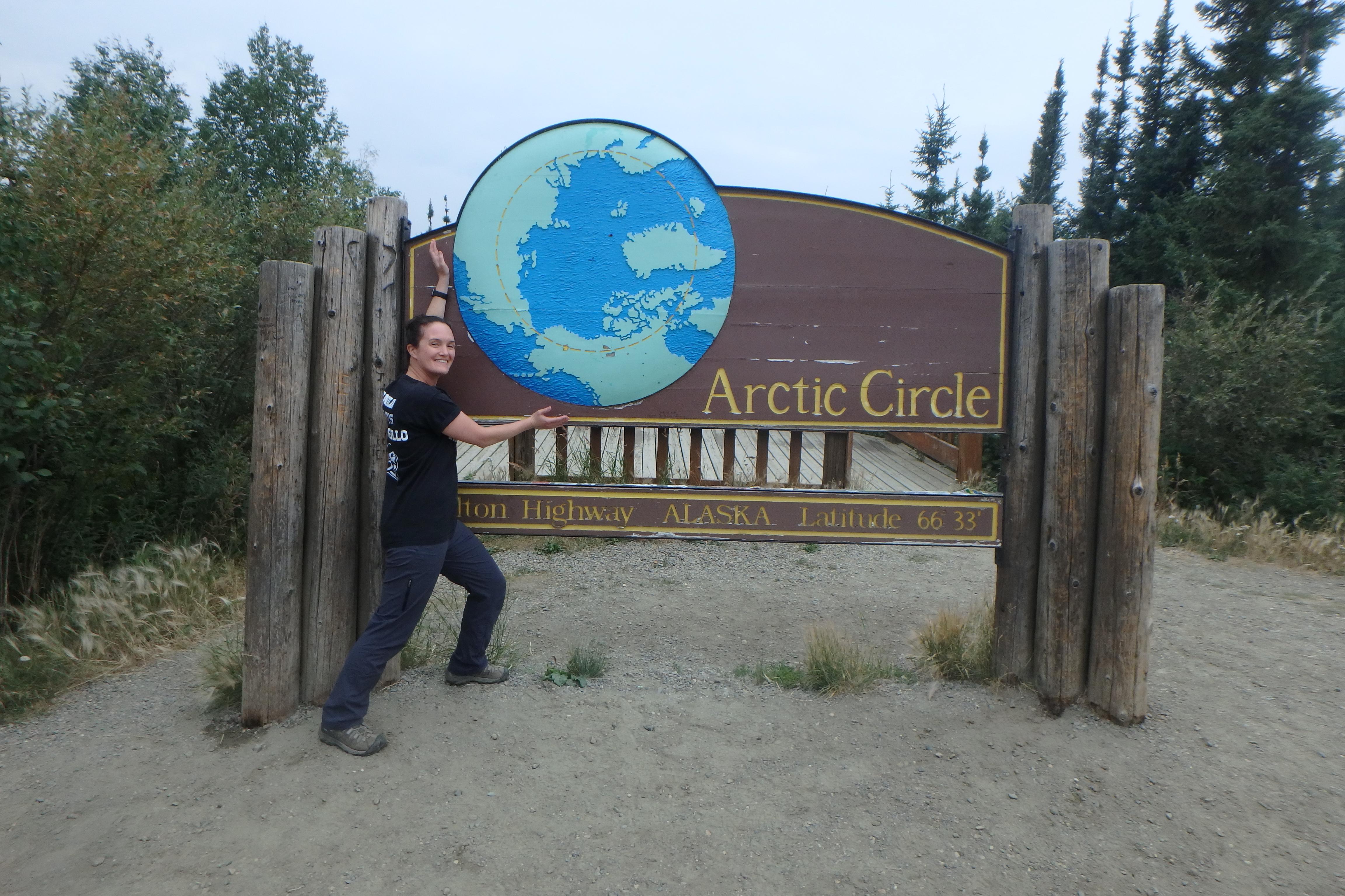 After driving five hours north from Fairbanks, the team makes a stop at the Arctic Circle sign. Dalton Highway, Alaska.