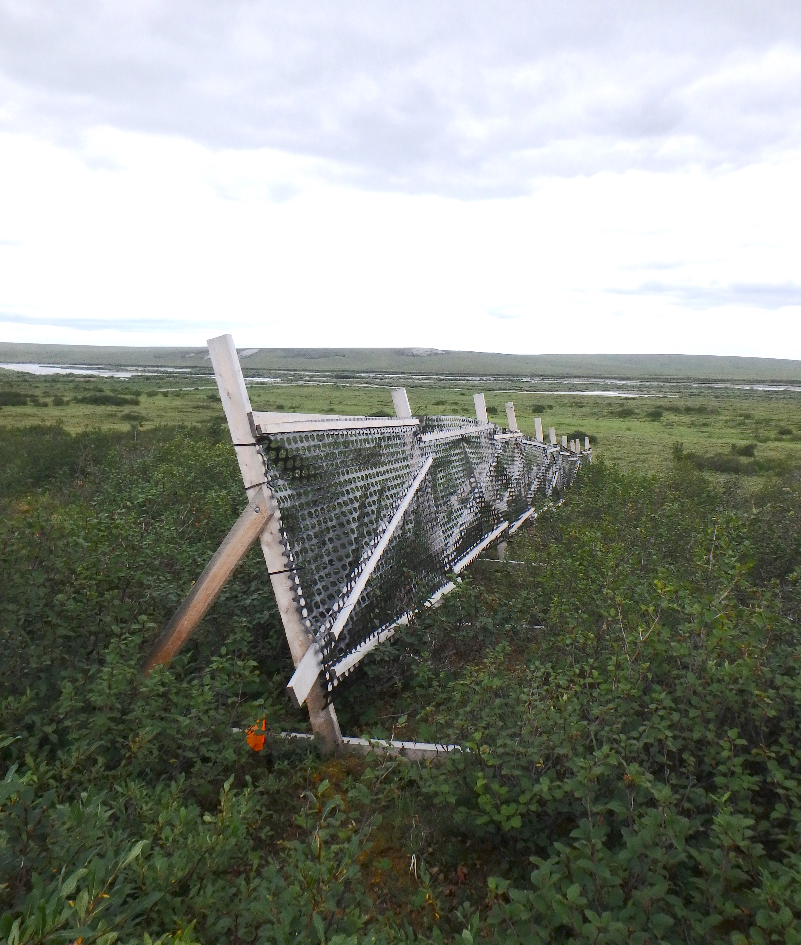 Snow fences are used to capture snow to replicate the same snow-piling effect that shrubs have. Near the Sagavanirktok River on the North Slope of Alaska.