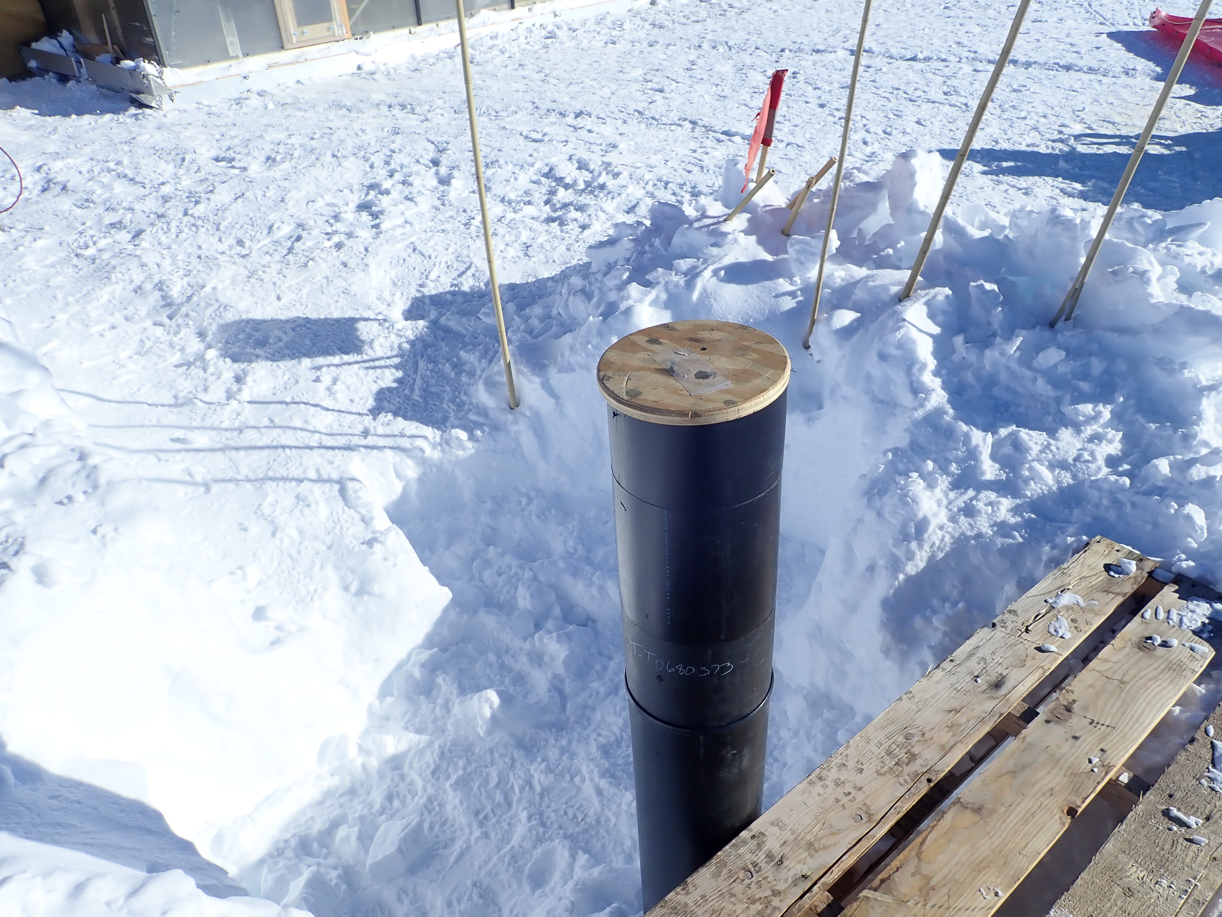 The black tube lines the opening of the SPICE Core hole. The goal of SPICE Core is to study different properties of the ice by deploying specialized devices into an open ice hole 1.75 km in depth. Amundsen-Scott South Pole Station, Antarctica.