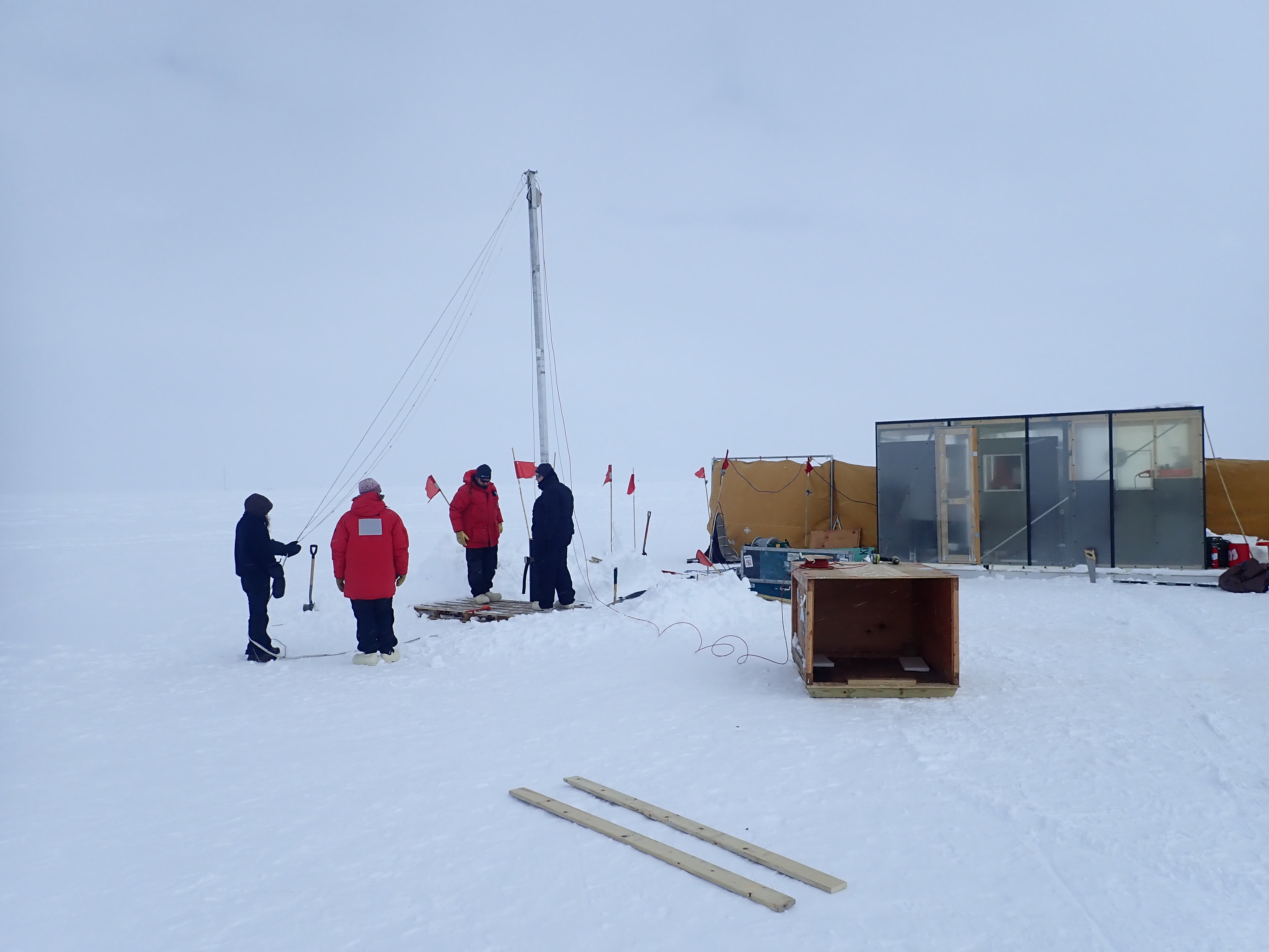 The tower and the cable winch complete the SPICE Core camp. The goal of SPICE Core is to study different properties of the ice by deploying specialized devices into an open ice hole 1.75 km in depth. Amundsen-Scott South Pole Station, Antarctica.
