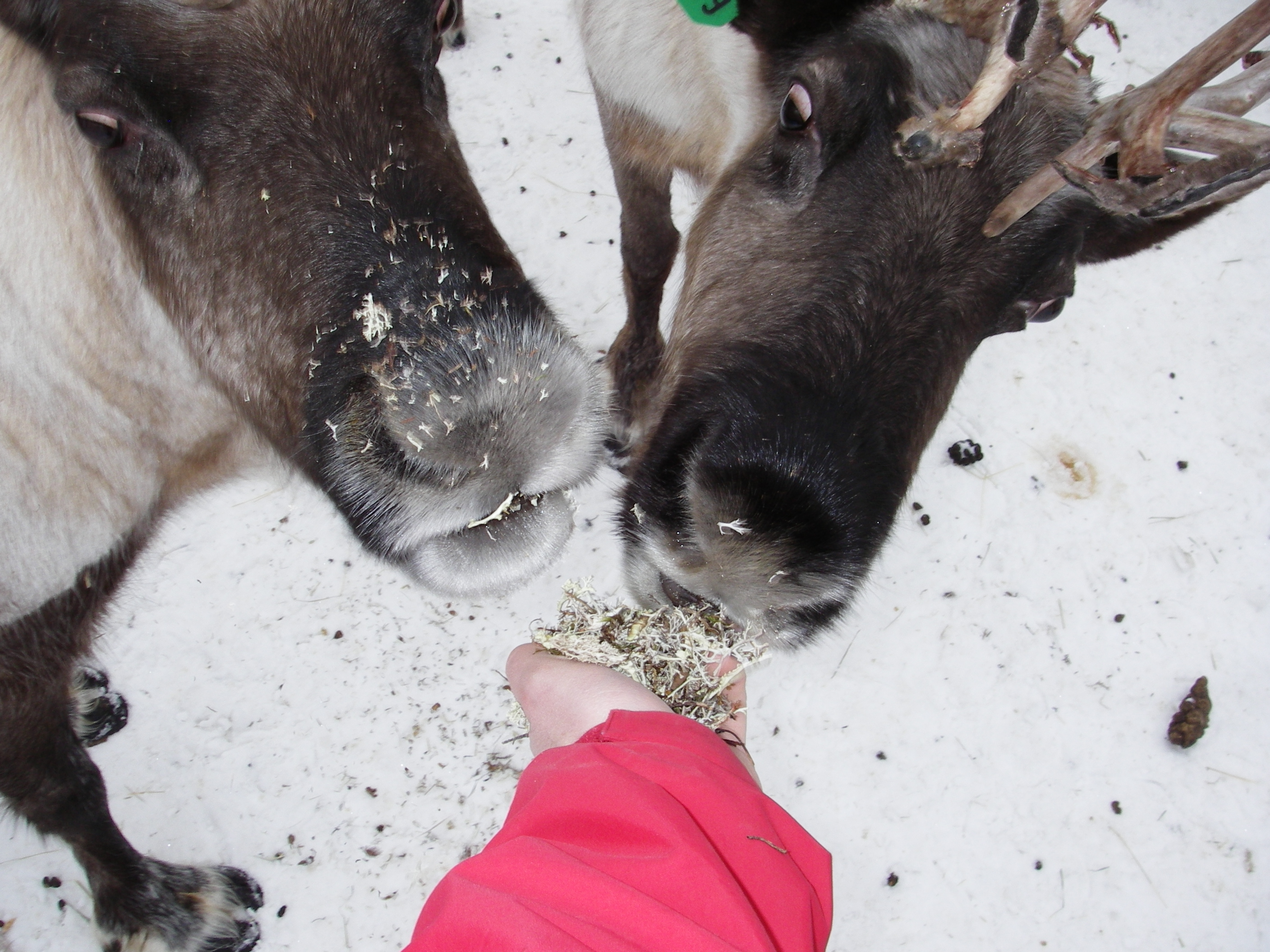 These reindeer nibble lichens from Craig Beals' hand. They were happy to see Craig Beals arrive in his jolly RED coat! At the Reindeer Research Program at the University of Alaska Fairbanks.