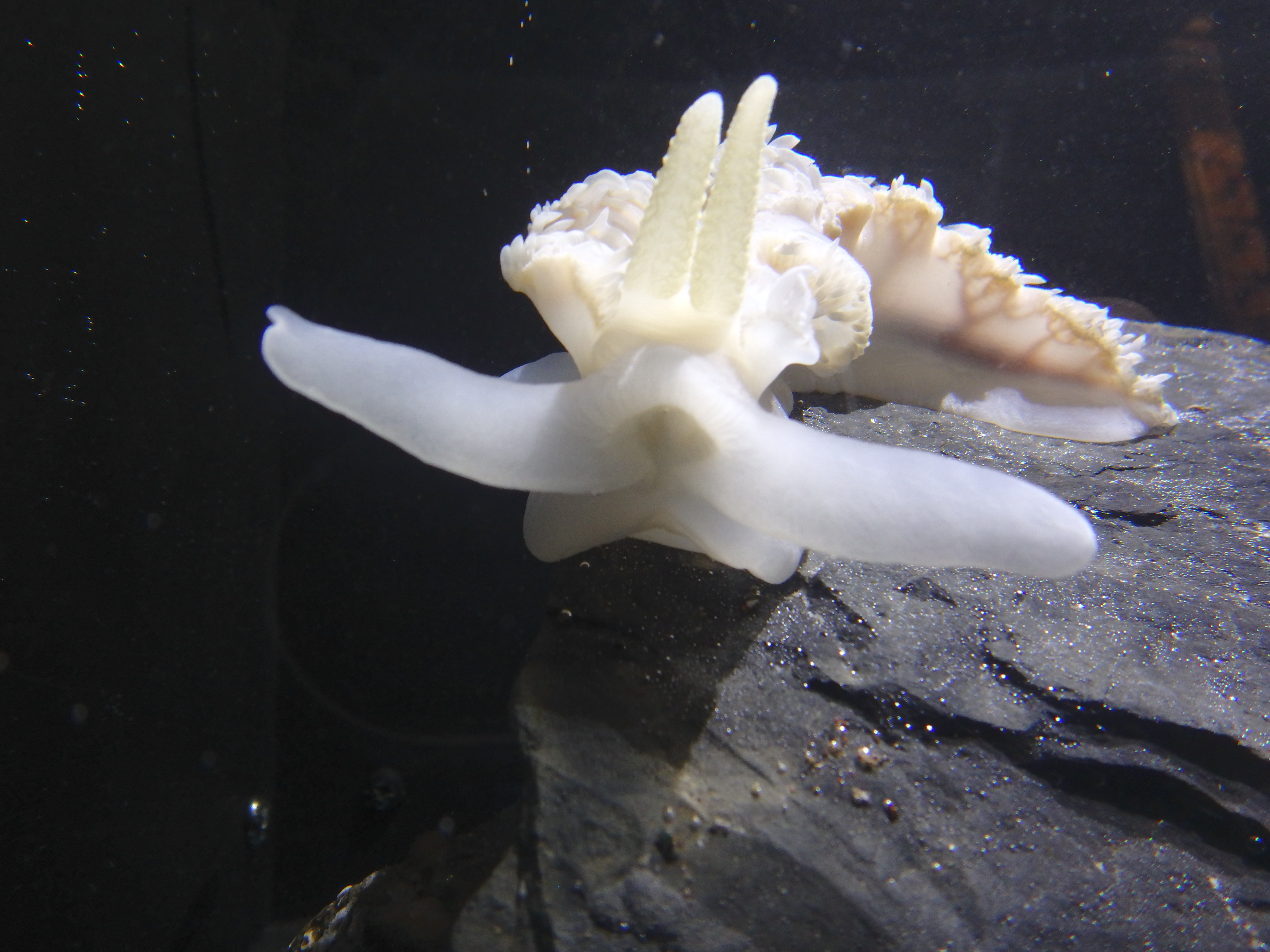 A nudibranch, genus Notaeolidia, crawls on a rock in a tank. The antenna-like structures on top of its head are called rhinophores and help them sense the world around them. Crary Lab, McMurdo Station, Antarctica.