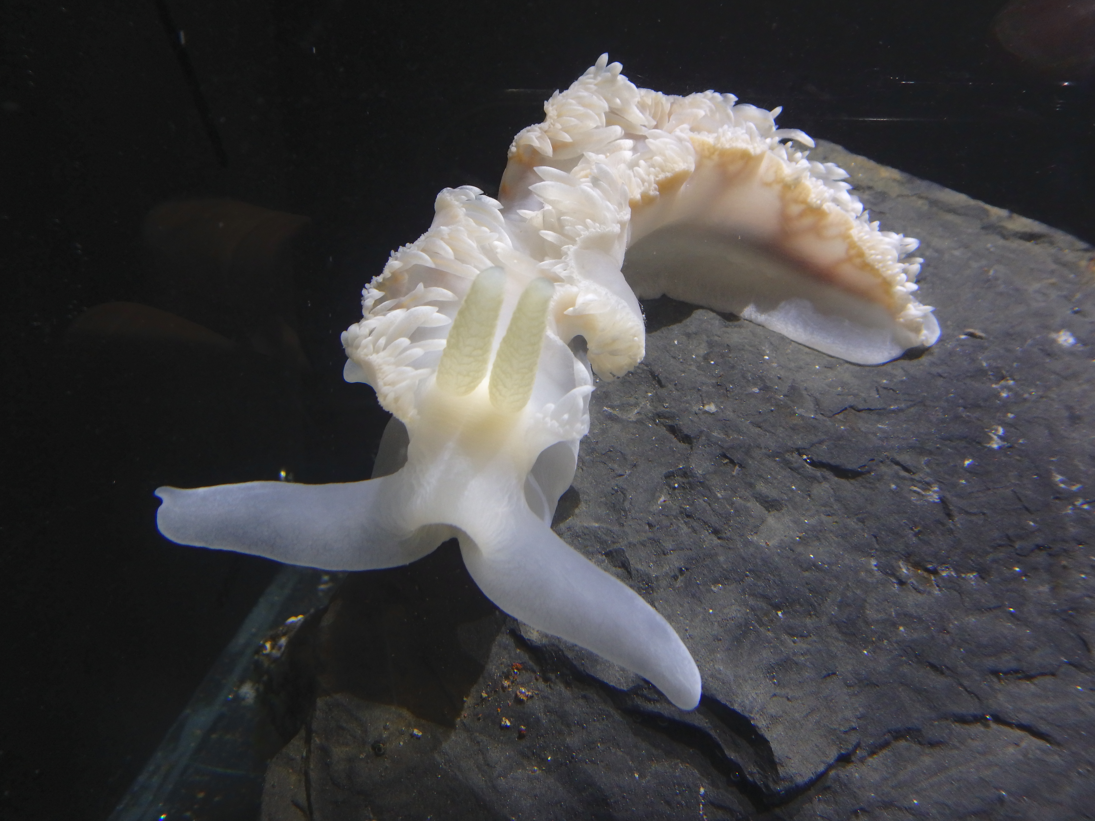 A nudibranch, genus Notaeolidia, crawls on a rock in a tank in the Crary Lab Aquarium, McMurdo Station, Antarctica.