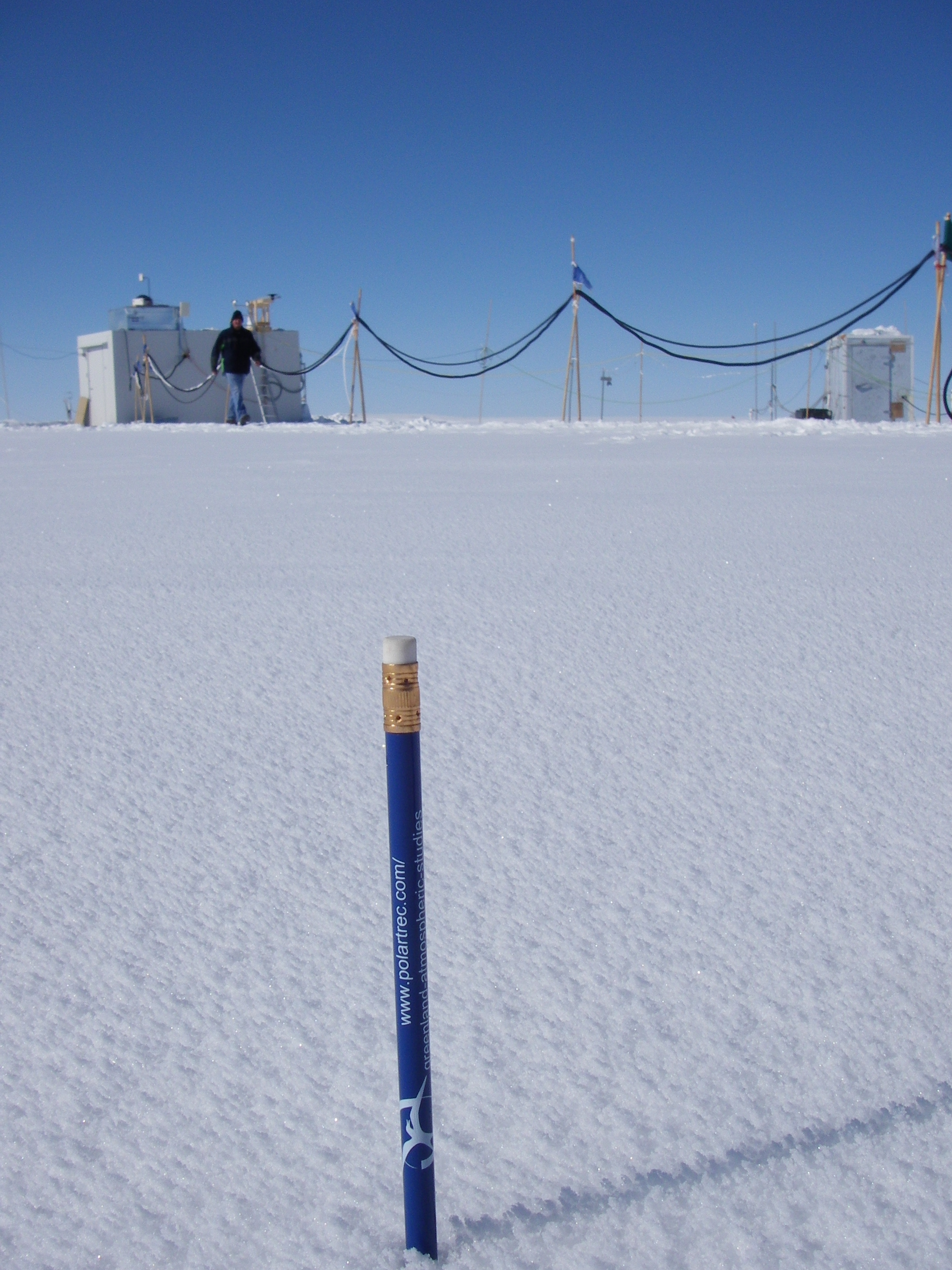 In order to compare shadow length between Billings, MT and Summit, Greenland, a pencil was stuck in the snow and measured at intervals specified by Mrs. Beals 5th Grade class at Bitterroot Elementary. Satellite "Sat" Camp, Greenland.