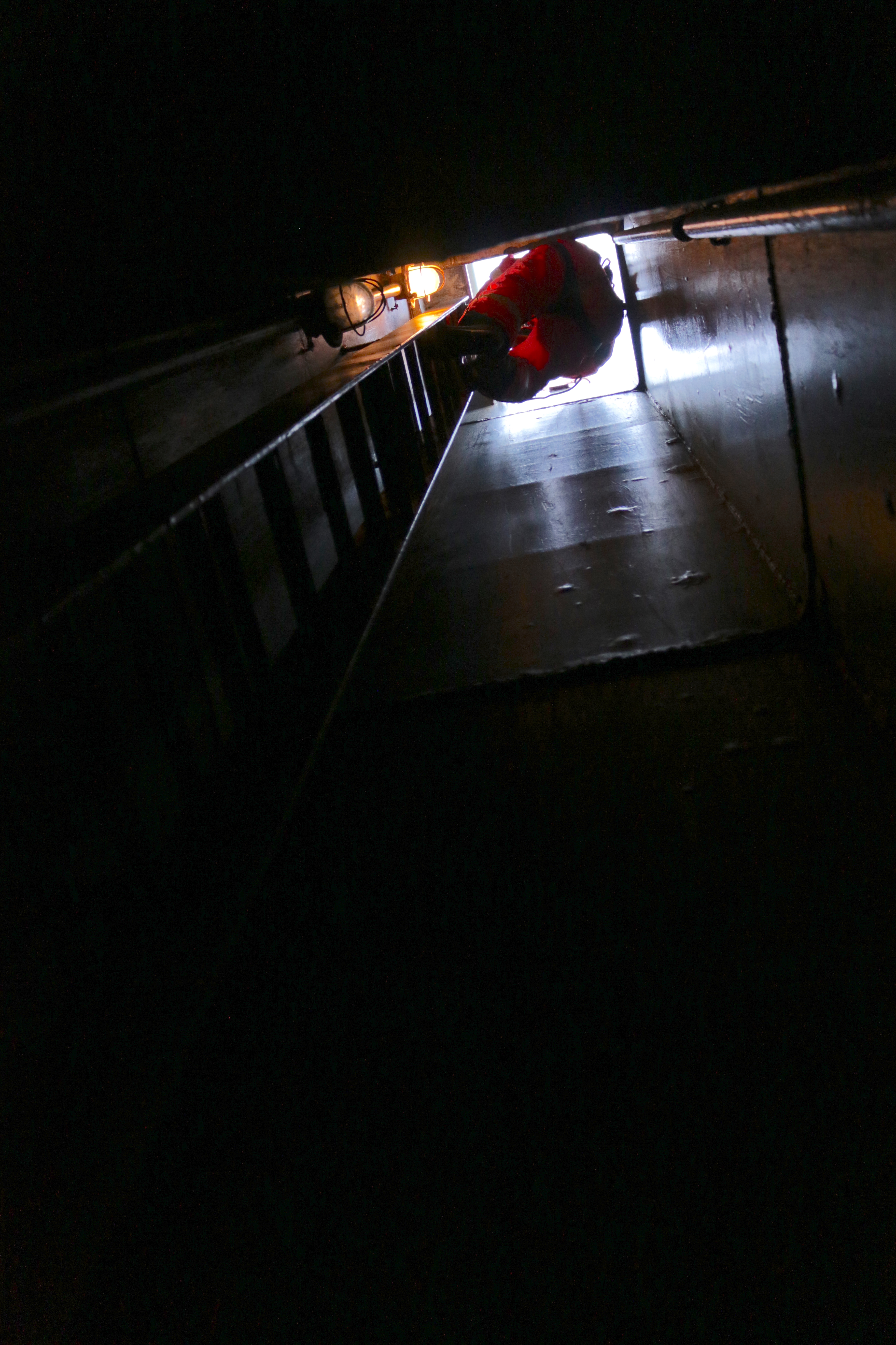 Much of the science equipment is stored in a large compartment in the ship called 'the hold.' In order to get to the hold to prepare the research equipment, scientists must climb a ladder down a long, narrow chute. Aboard the R/V Akademik Fedorov in the Central Arctic Ocean.
