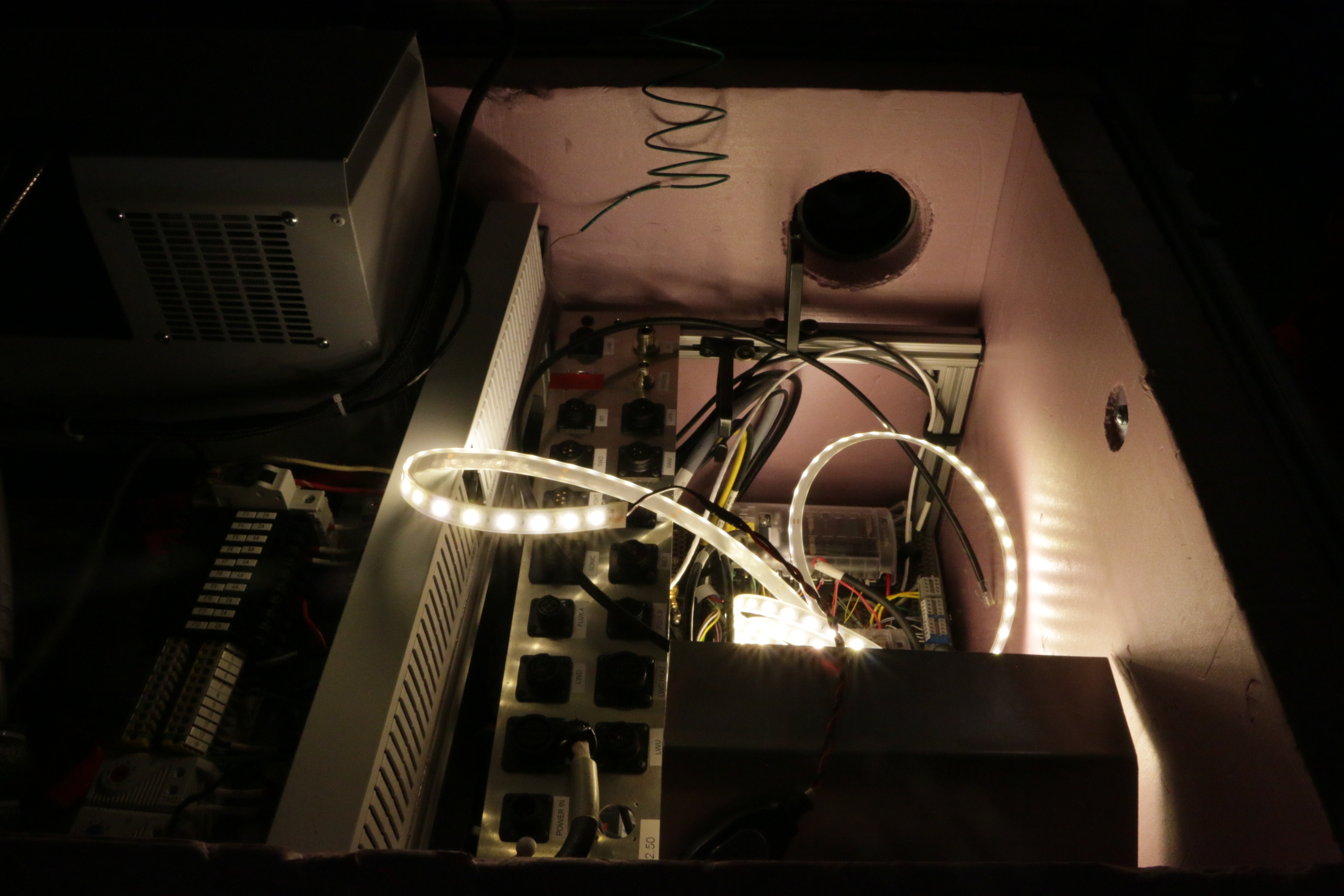 A strand of LED lights illuminates the inside of the Atmospheric Surface Flux Station (ASFS) sled. Cables for the sensors on the ASFS sled draw power and deliver data. On the R/V Akademik Fedorov in the Central Arctic Ocean.