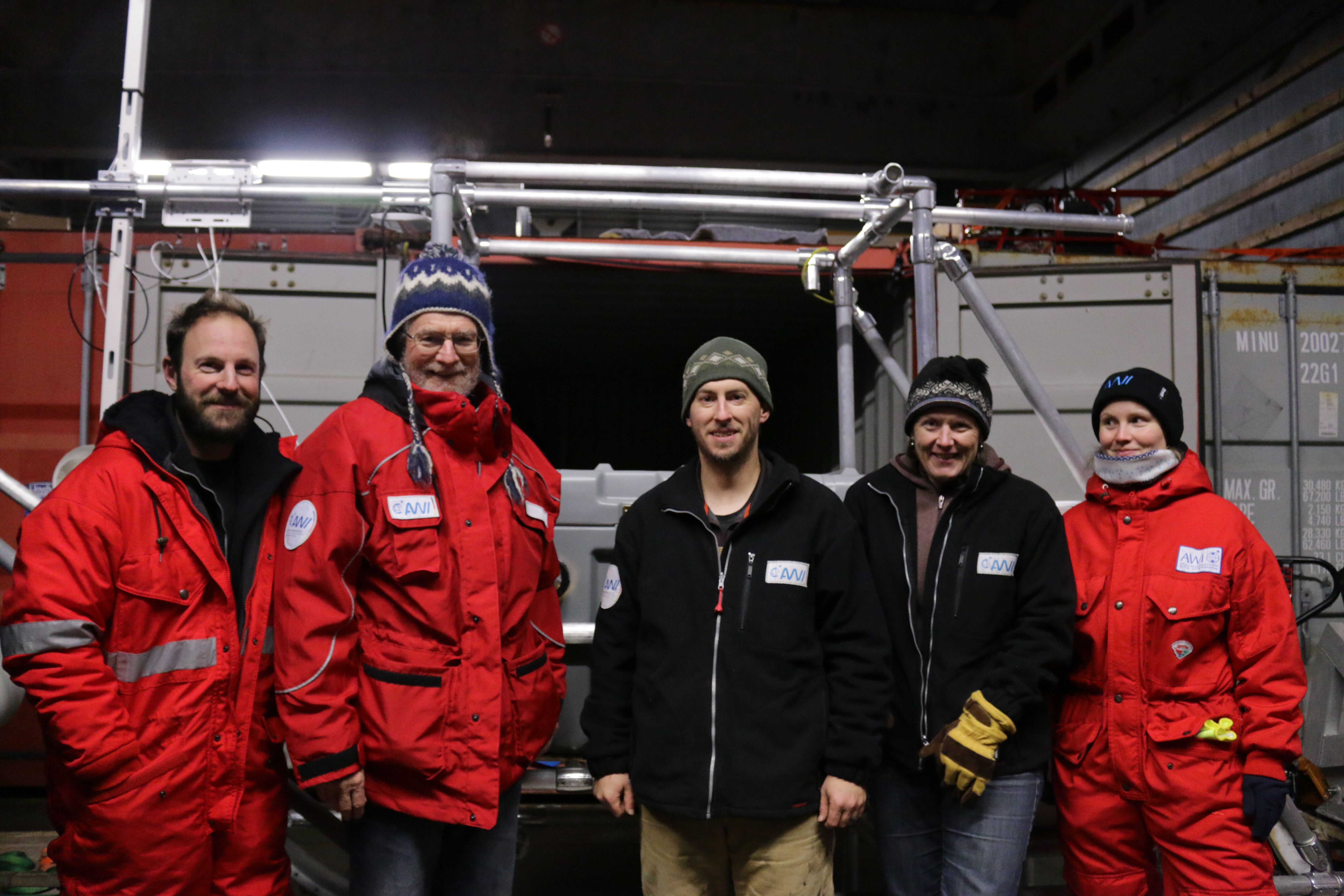 Sean Horvath, Ola Pederson, Chris Cox, and Anne Gold (all from the University of Colorado Boulder) and Tatiana Matveeva from the MOSAiC School pose in front of the Atmospheric Surface Flux Station (ASFS) sled that they will deploy at the L2 site. On the R/V Akademik Fedorov in the Central Arctic Ocean.