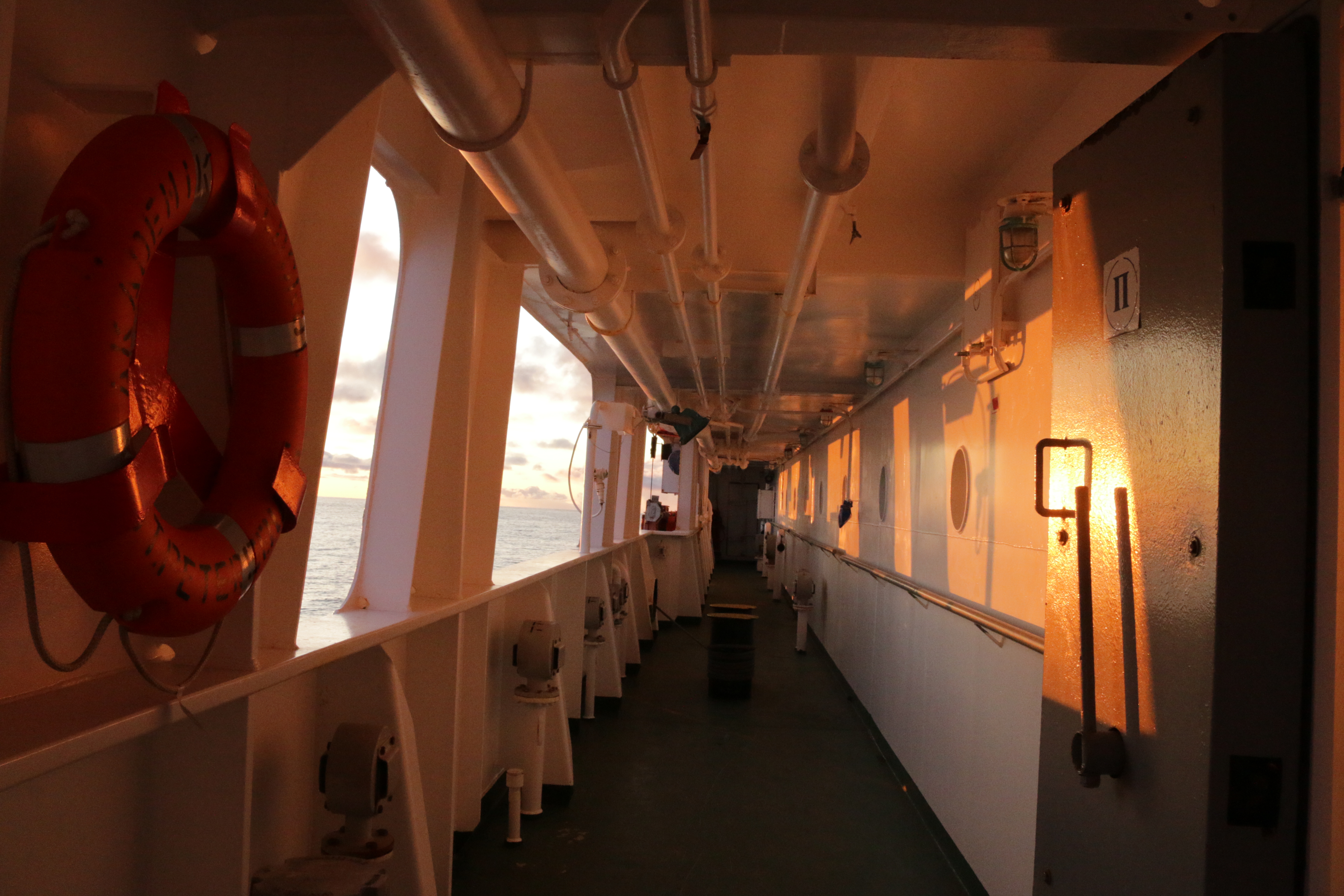 Sunlight warms the deck of the ship as it heads south to the port of Tromsø, Norway. Aboard the R/V Akademik Fedorov in the Barents Sea.