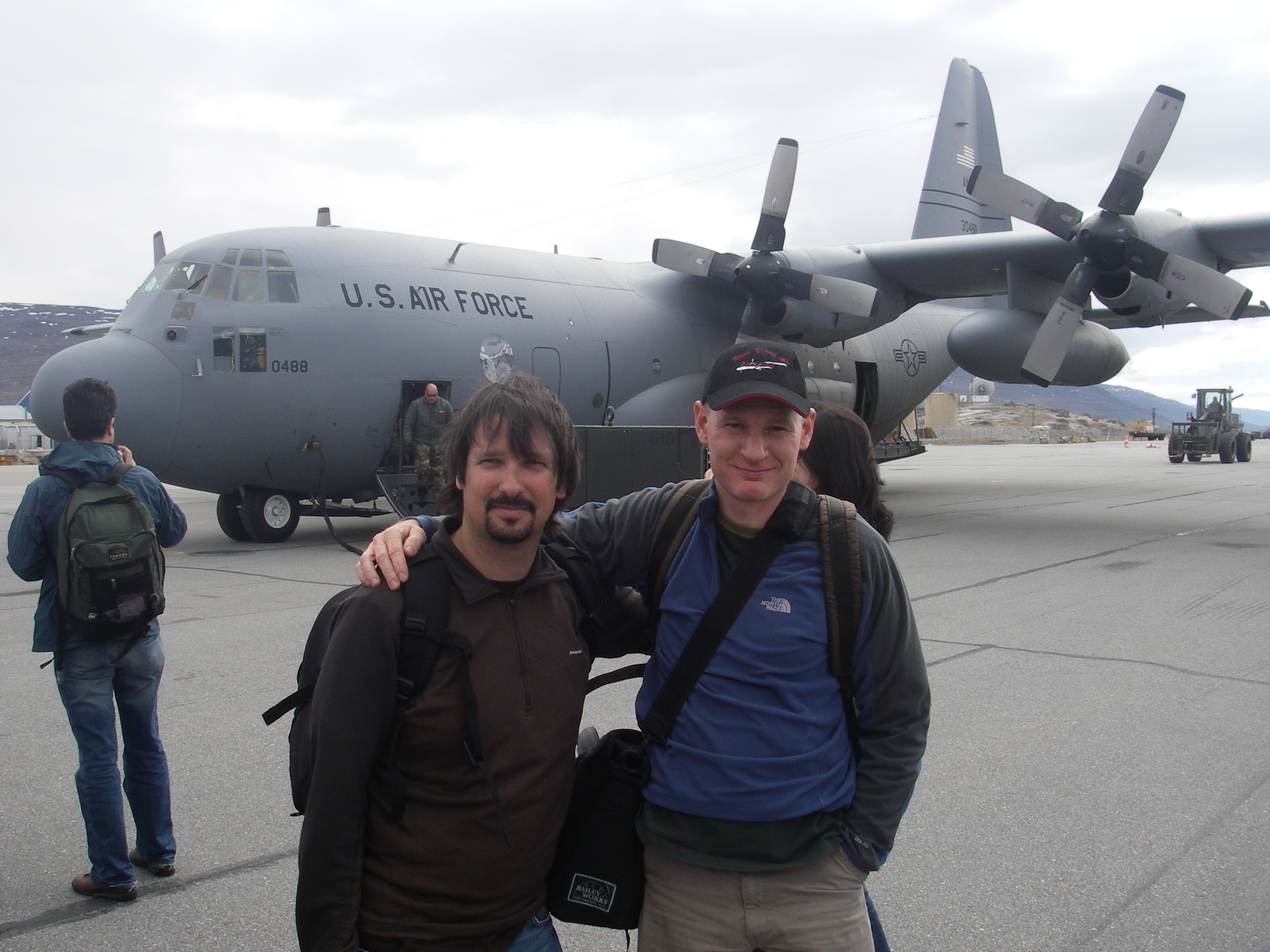 Barry Lefer and Craig Clements hop off the C-130 at the Kanger Airport in Kangerlussuaq, Greenland.