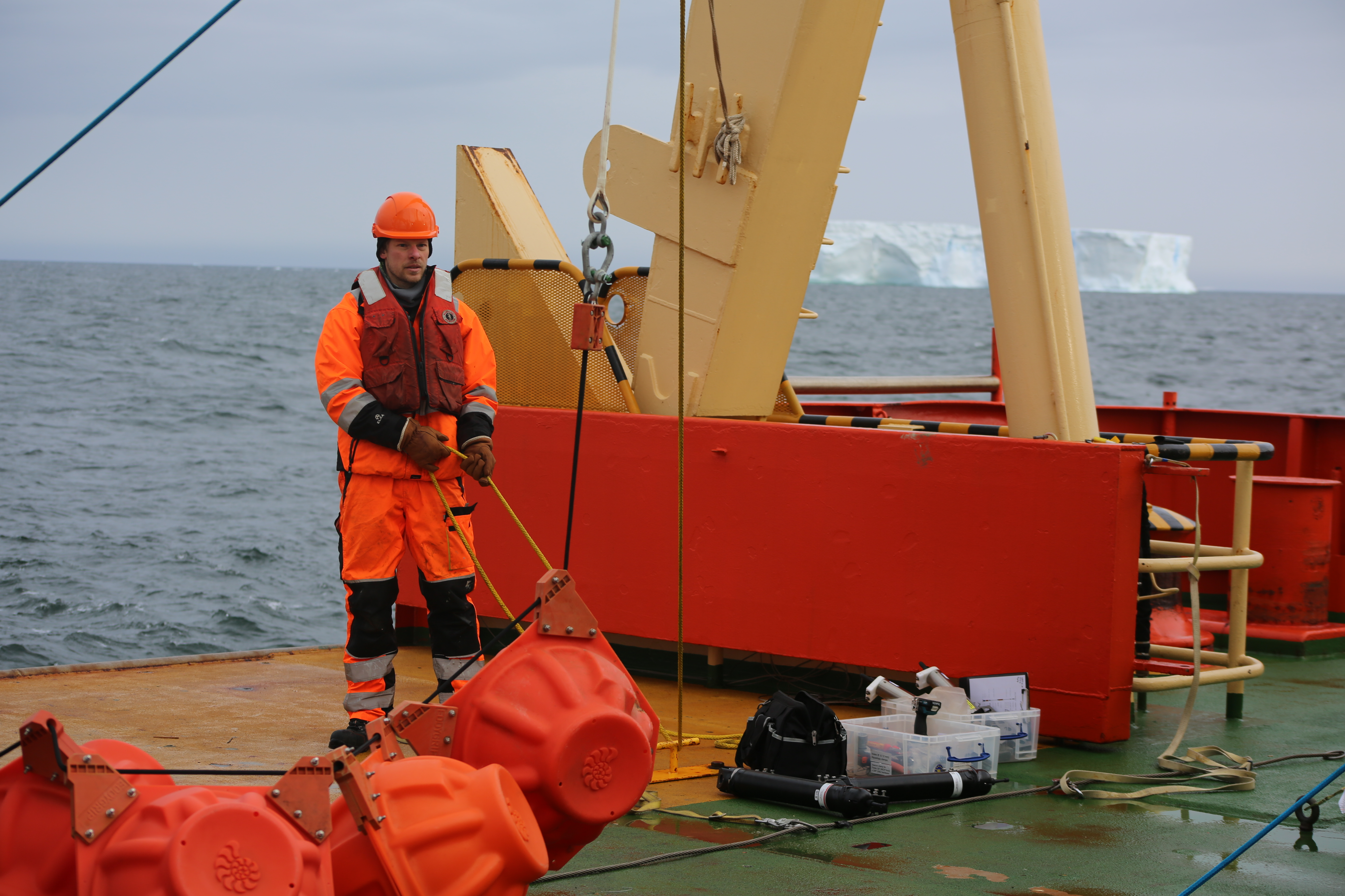 Researcher Mark Barham of the British Antarctic Survey deploys a float that will collect water chemistry data for at least a year before being retrieved on a later voyage. Aboard the R/V Nathaniel B. Palmer icebreaker in the Southern Ocean.