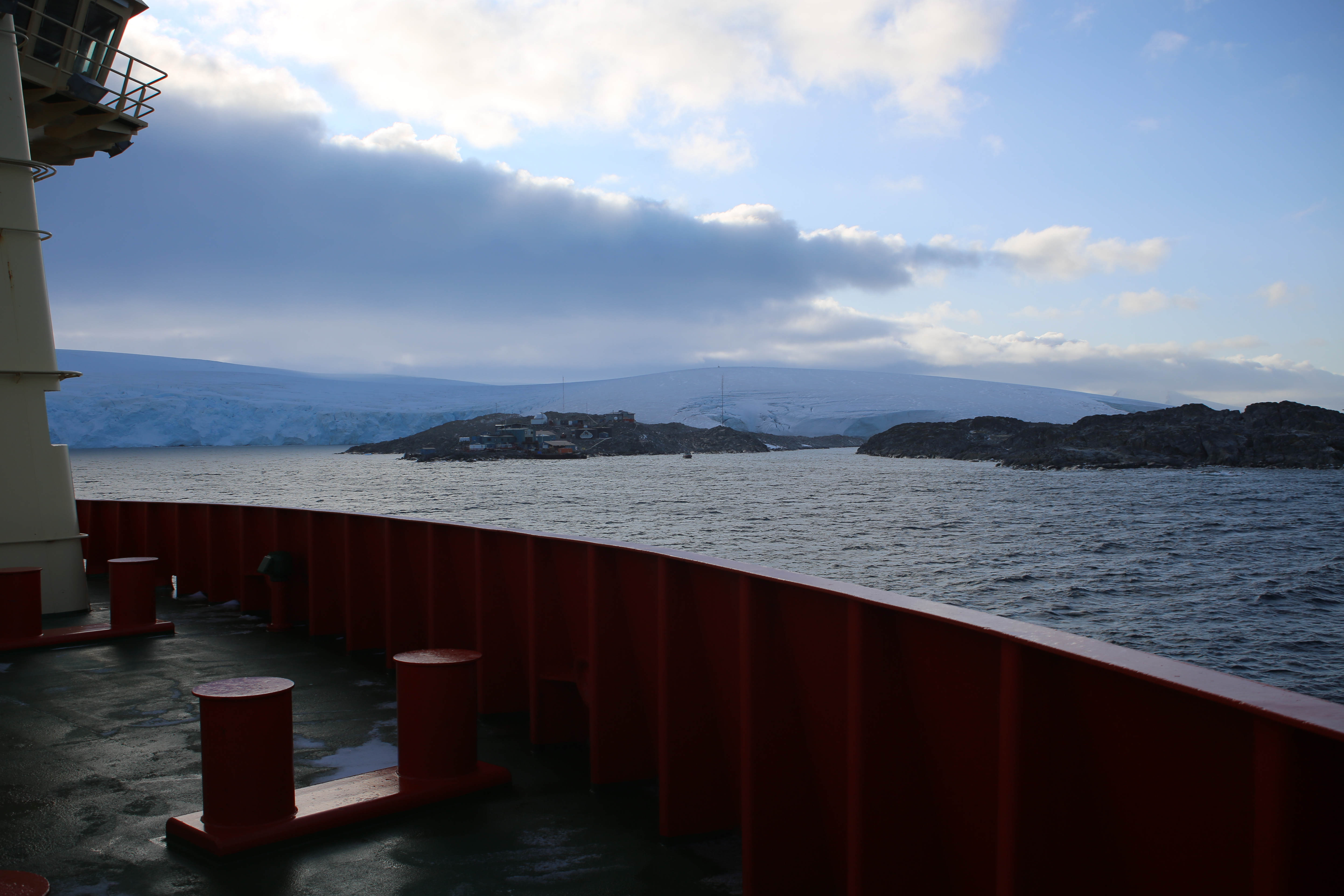 Sarah Slack: "Looking back across the port deck to Palmer Research Station (which has the same namesake as our ship). Boat passengers were not permitted to disembark due to health concerns but we were able to admire the station from afar." Aboard the R/V Nathaniel B. Palmer icebreaker, just offshore from Palmer Station, Antarctica.