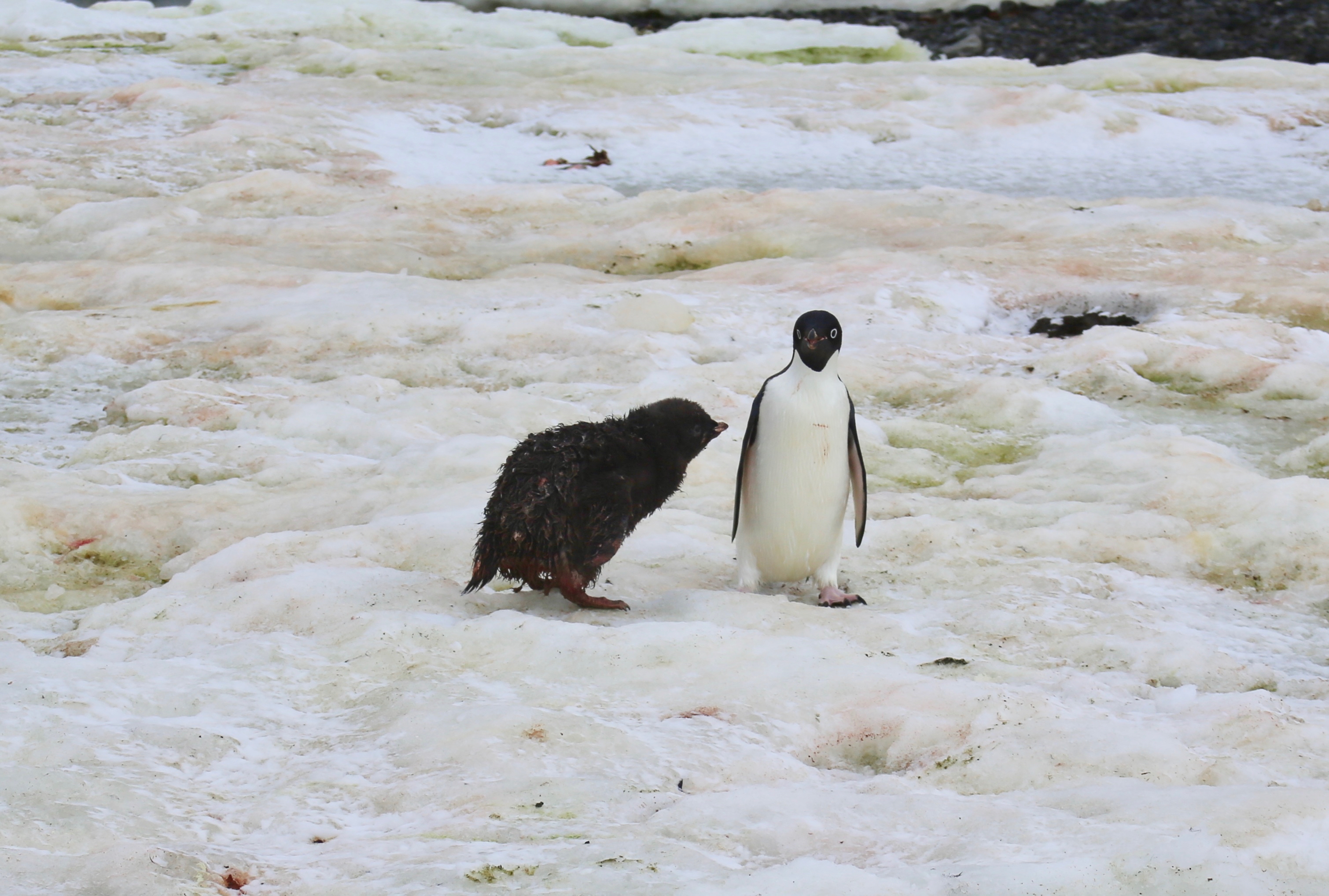 An Adélie penguin and its chick. Edwards Islands #4, Amundsen Sea, Antarctica.