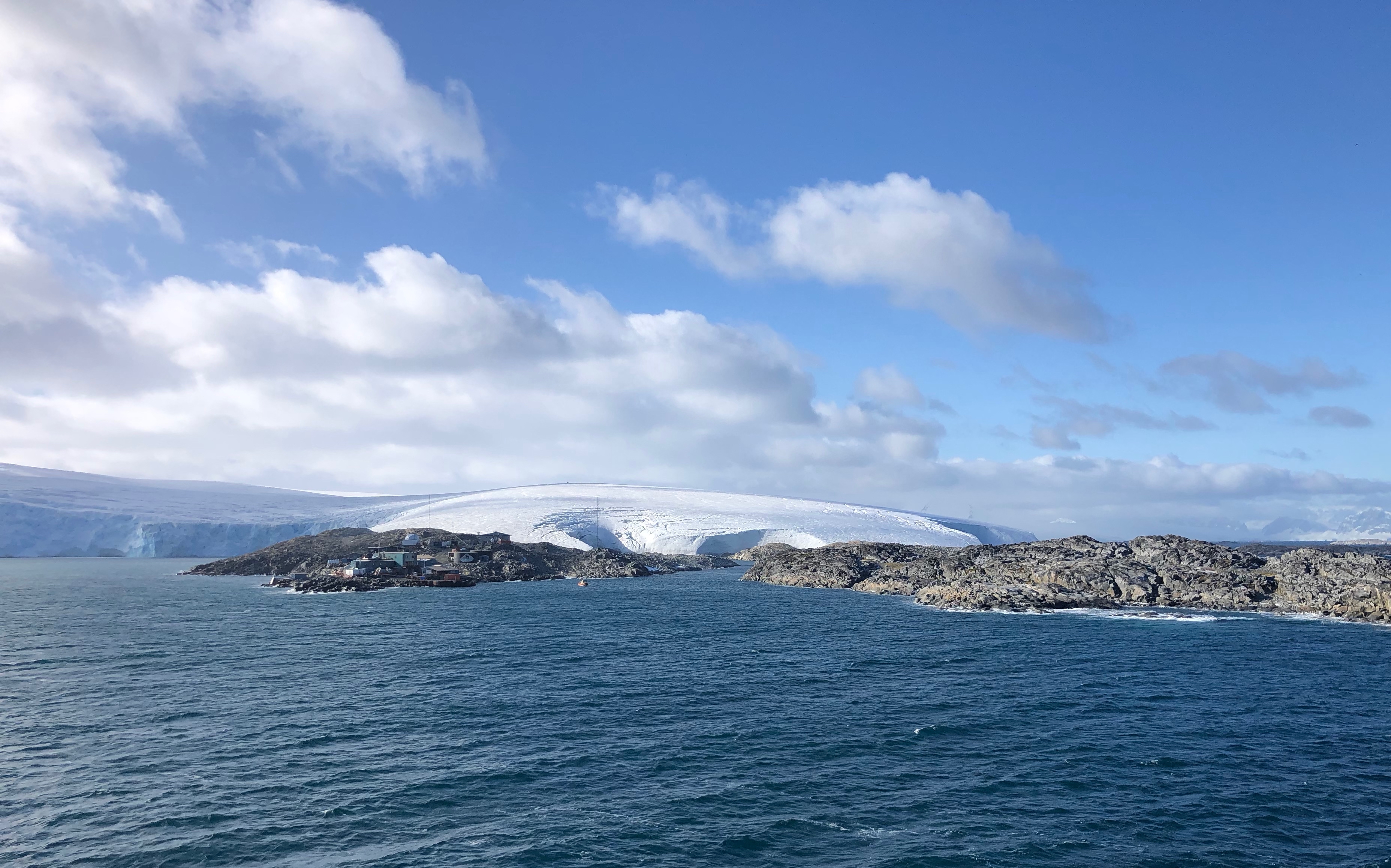 A view looking back at Palmer Research Station (which has the same namesake as the ship). Boat passengers were not permitted to disembark due to health concerns. Aboard the R/V Nathaniel B. Palmer icebreaker in the Southern Ocean.