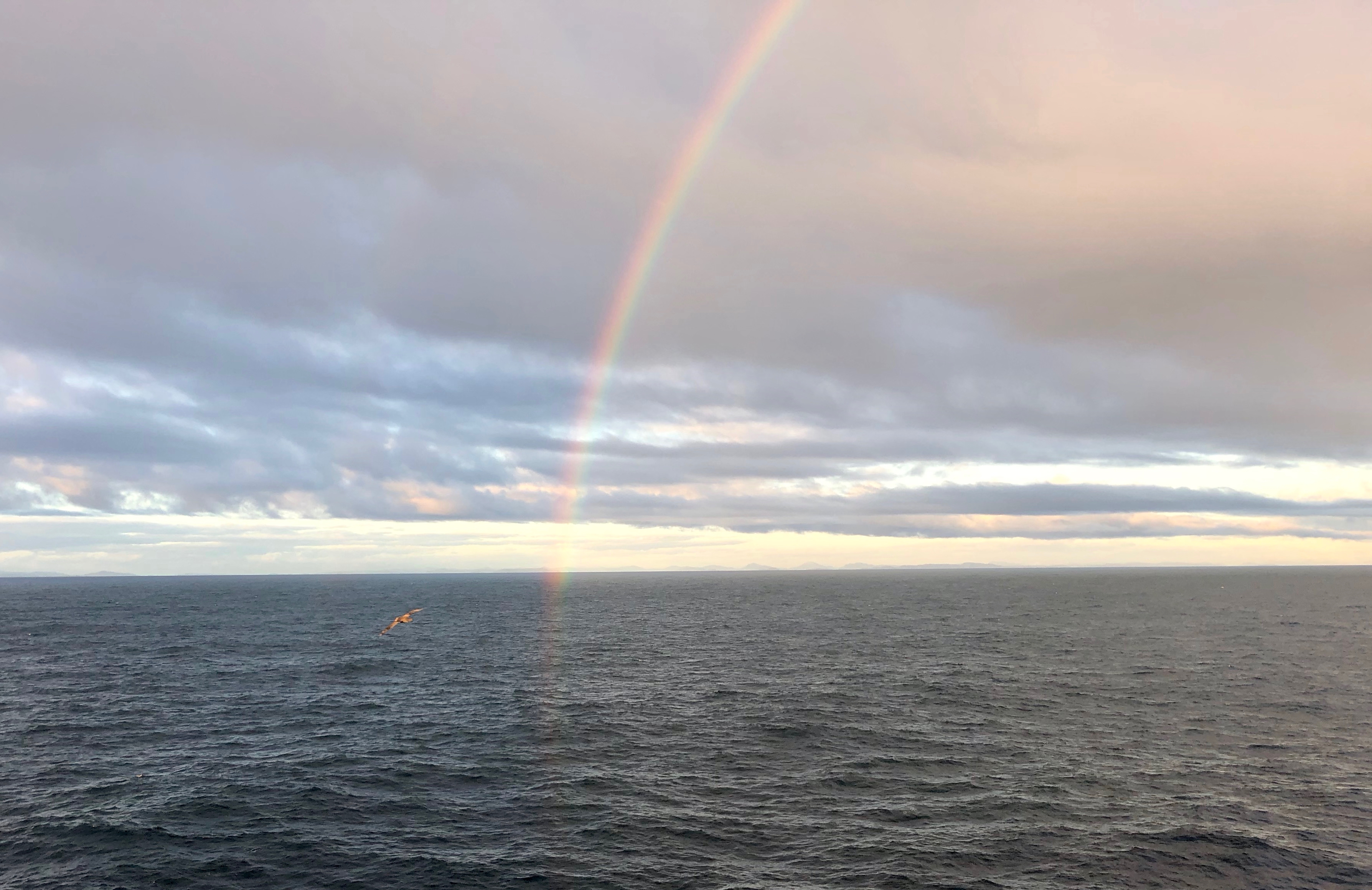 Sarah Slack: "As we approach the end of the Drake Passage, the water calms down considerably and a rainbow is spotted off the port bow." Aboard the R/V Nathaniel B. Palmer icebreaker in the Southern Ocean.