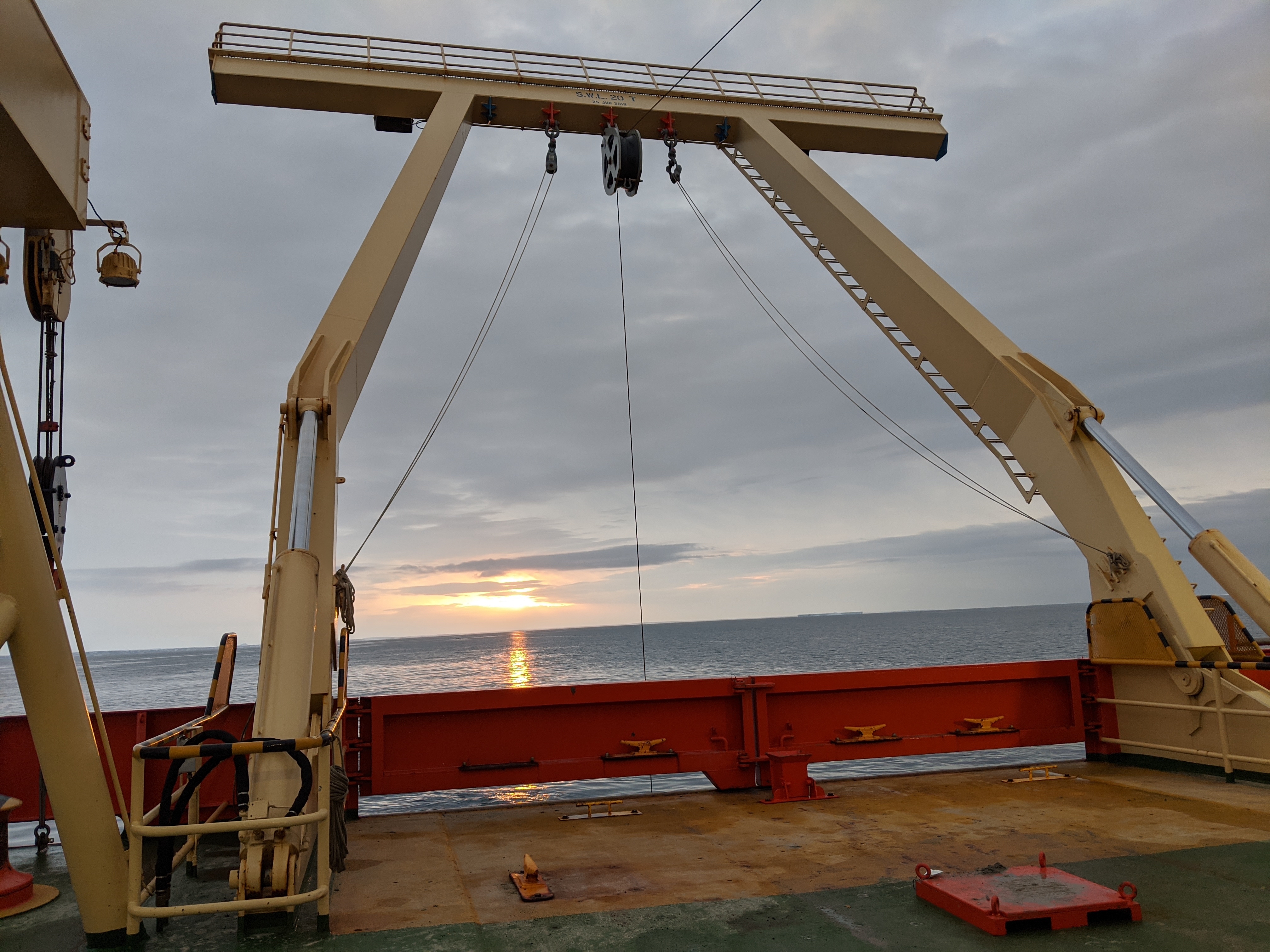 The ship's A-frame is used to raise and lower heavy equipment into the water. Aboard the R/V Nathaniel B. Palmer icebreaker in the Southern Ocean.