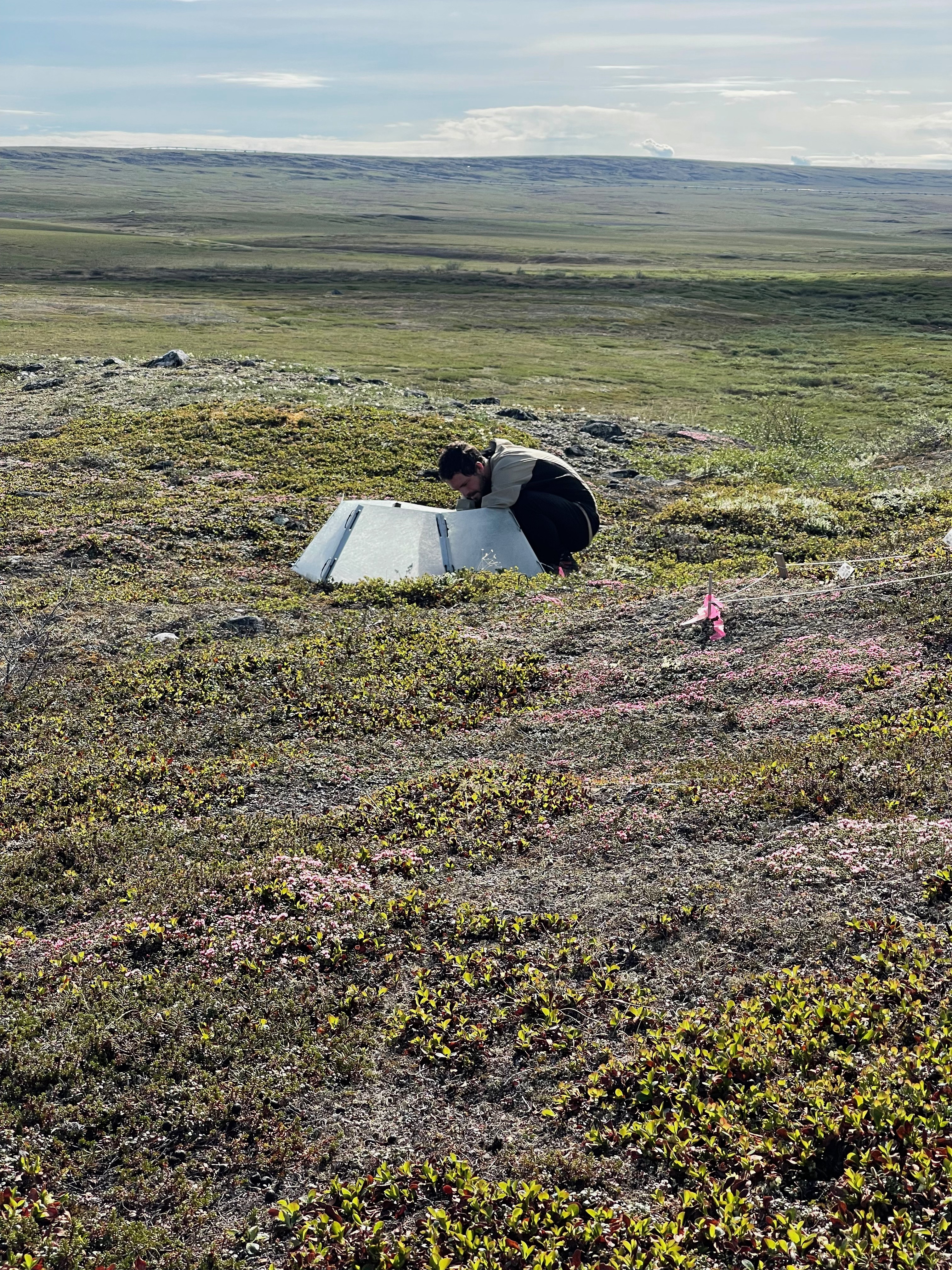 Alex Jennings conducts a "visitor" watch on an open top chamber. He is looking for possible pollnators. International Tundra Experiment Arctic Observatory Network (ITEX-AON) plots at Toolik Field Station, Alaska.