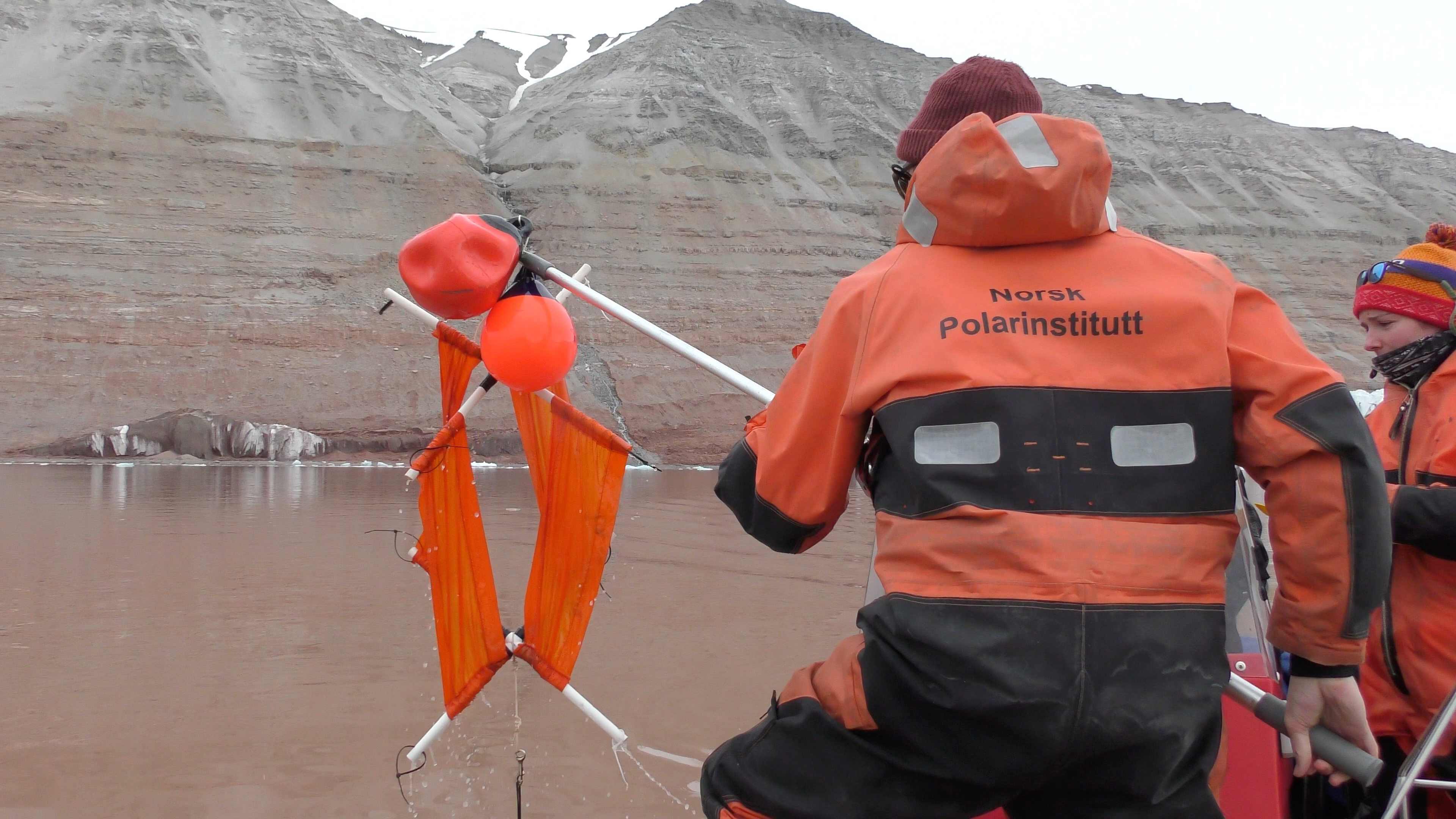 Xander Kirshen retrieves the drogue using a boat hook. Ny Ă…lesund, Svalbard, Norway.