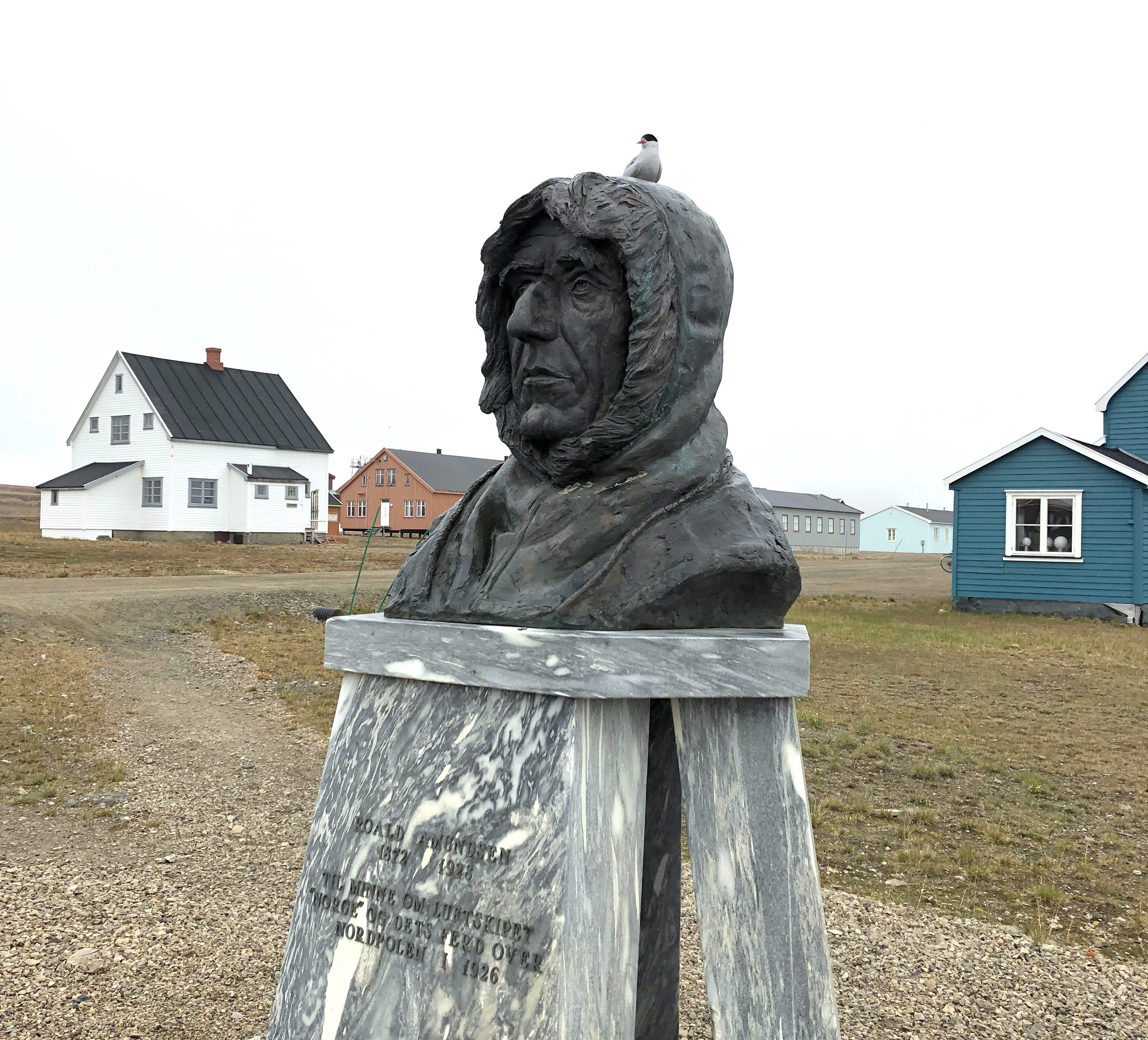A statue of polar explorer Roald Amundsen, with an Arctic tern perched atop his head. Ny Ă…lesund, Svalbard, Norway.