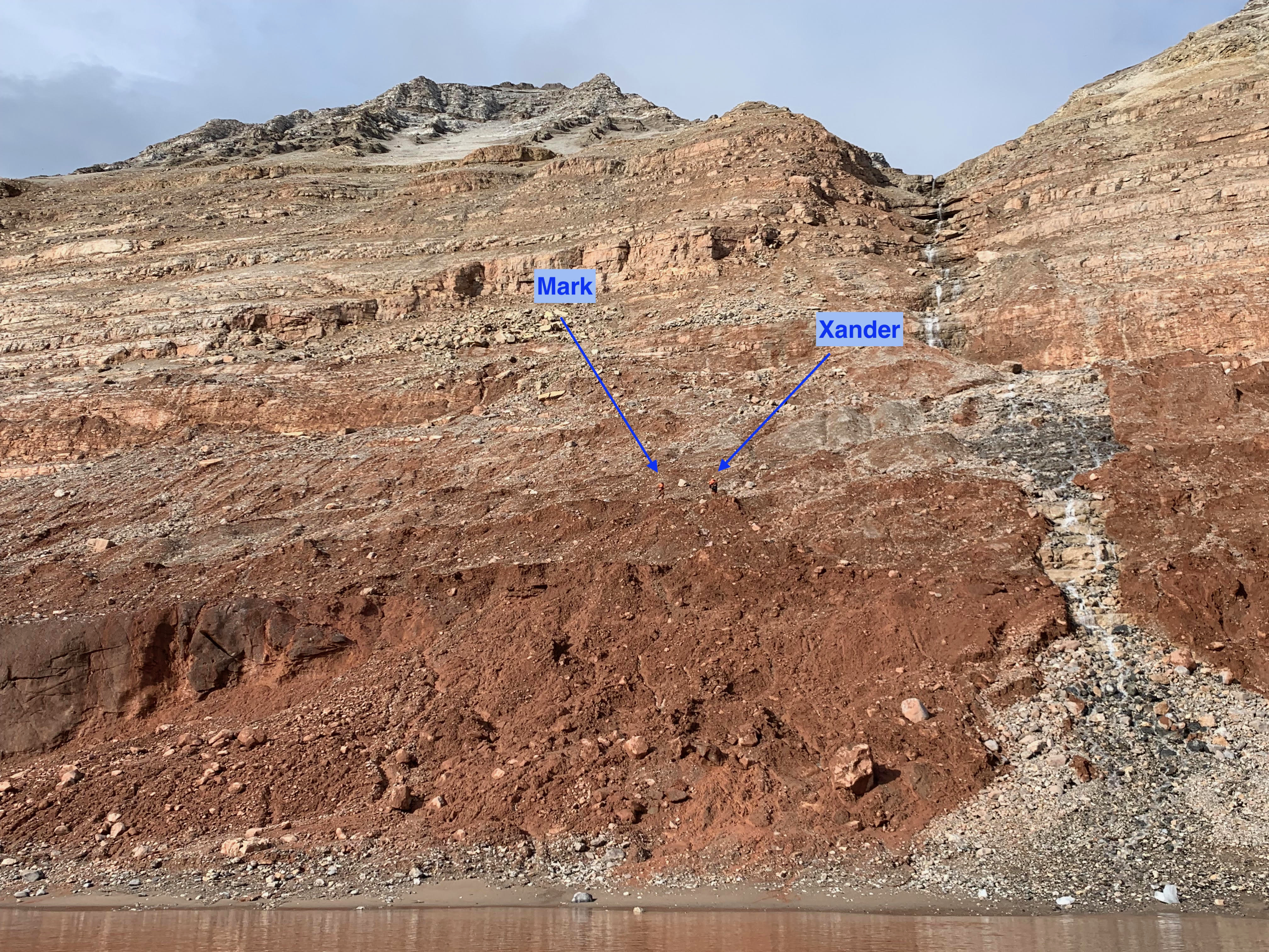 Xander Kirshen and Mark Goldner high up on a hillside searching for the team's lost drone. Ny Ă…lesund, Svalbard, Norway.