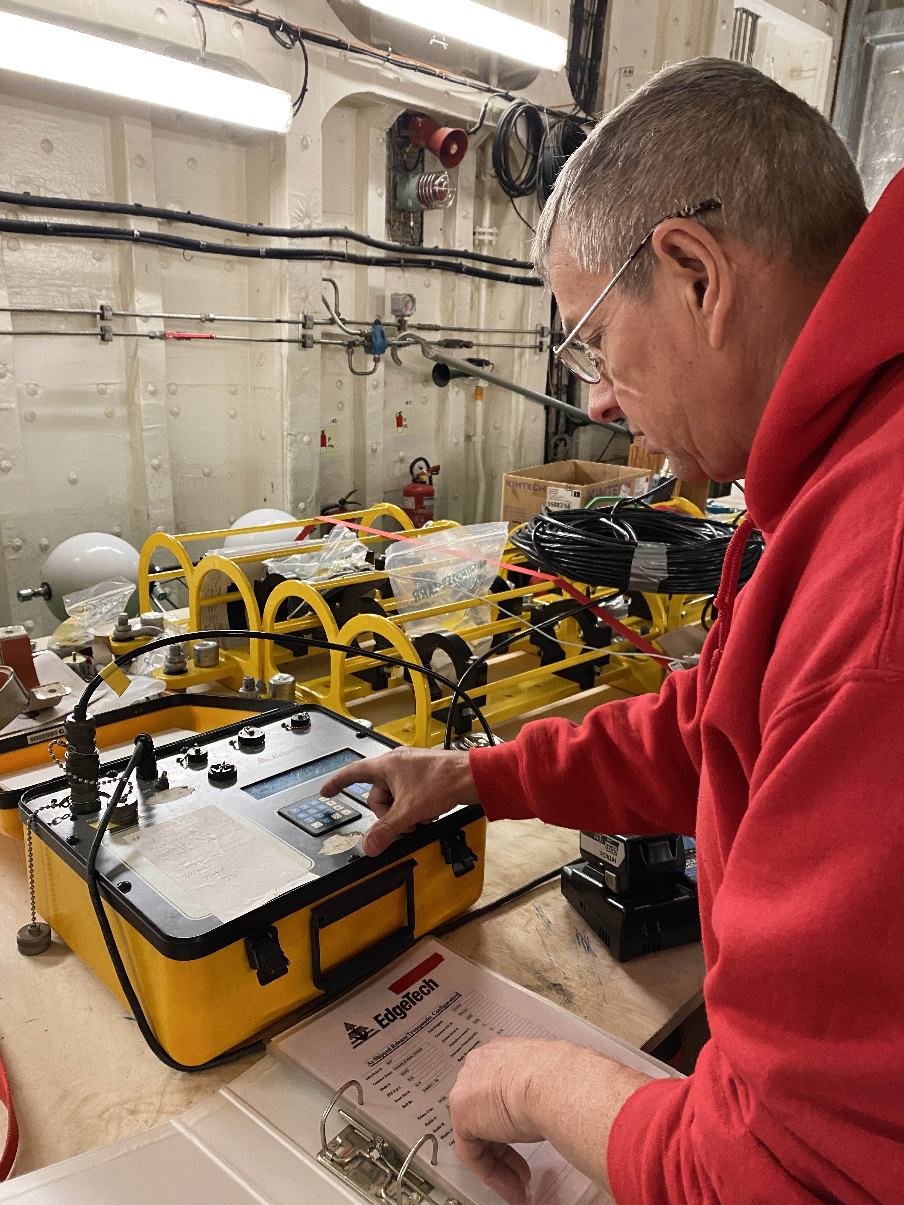 WHOI (Woods Hole Oceanographic Institution) technician Jim Dunn checks the codes for the mooring release mechanisms. Aboard the Akademik Tryoshnikov in the Laptev Sea.