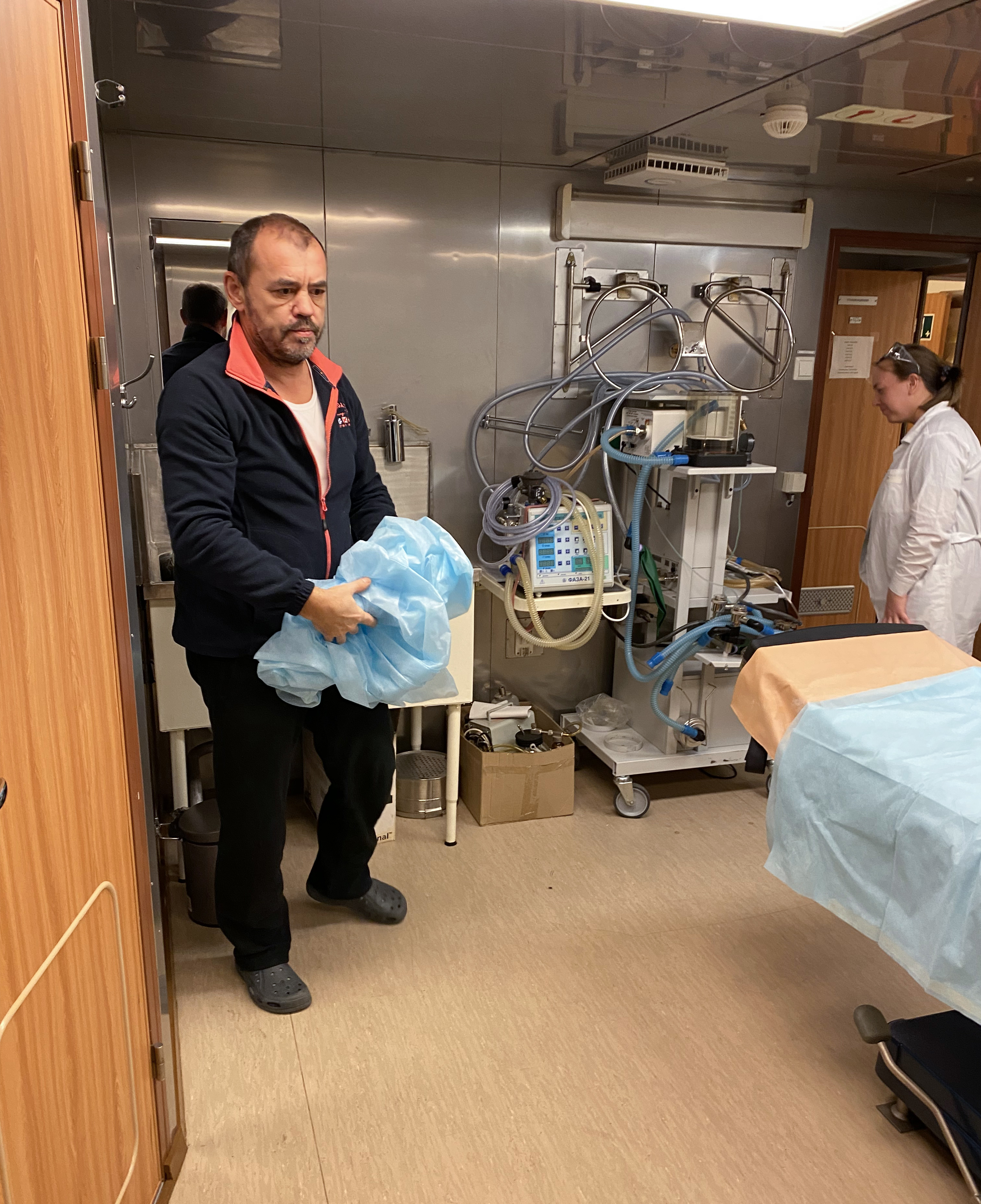Doctor and dentist Nikolai Kozlovski gives a tour of the medical suite. Aboard the Akademik Tryoshnikov in the Laptev Sea.