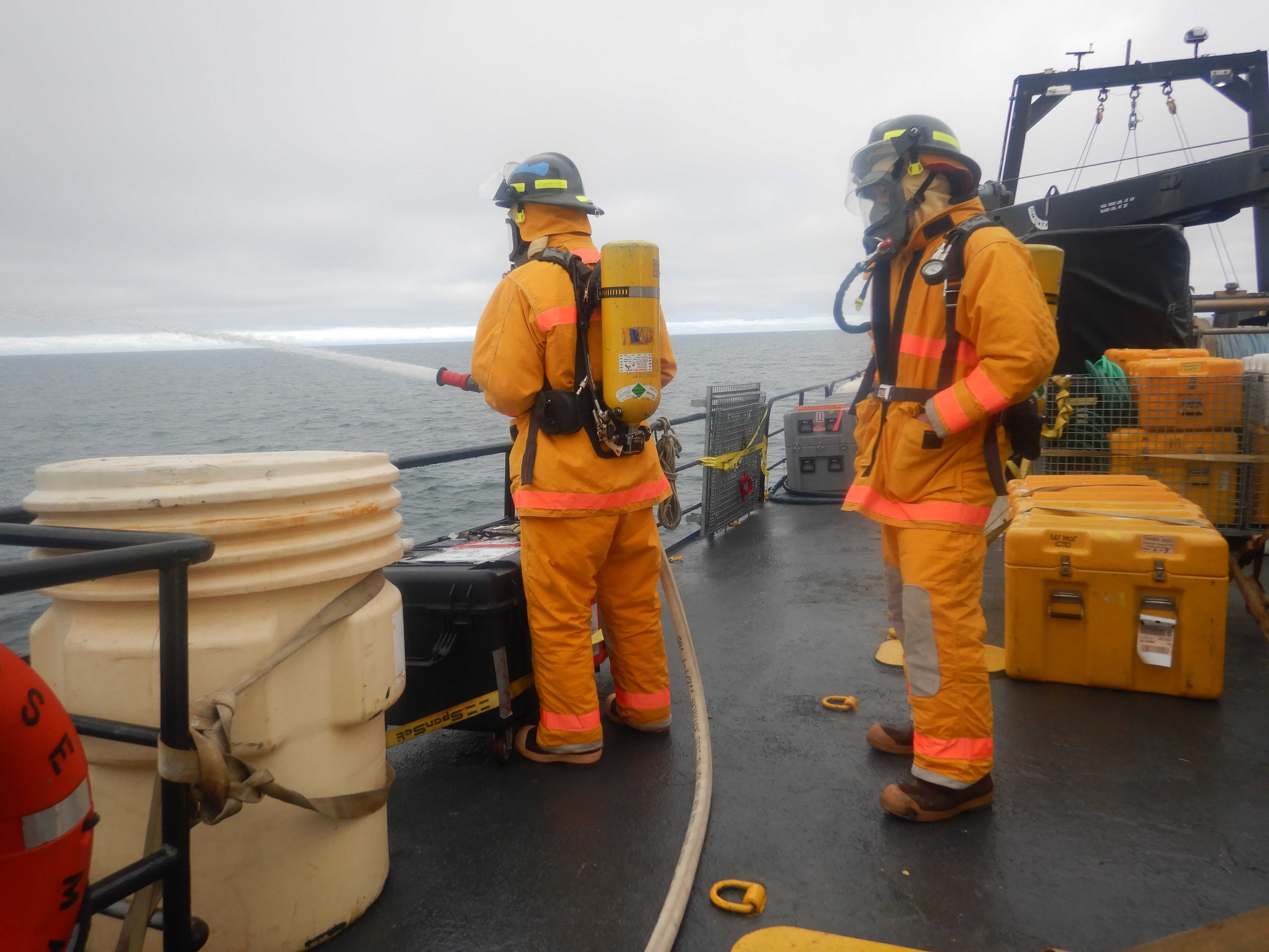 Mike Leifeste and Josh Bradshow conduct a fire drill. Aboard the Norseman II in Powooiliak Bay, Bering Sea.