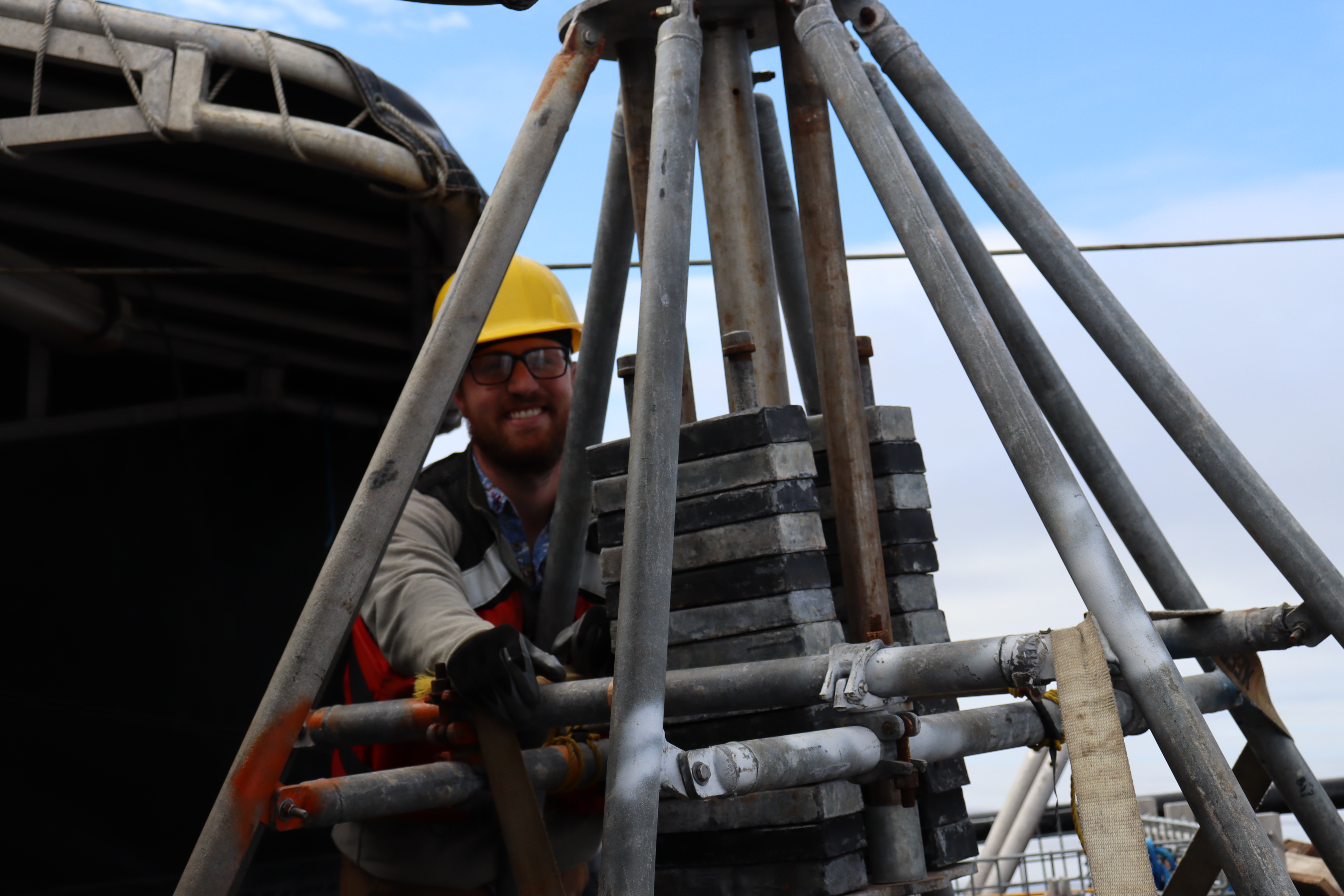 Coring specialist Ben Frieberg leans on the multicore. Aboard the Norseman II in the Chukchi Sea.