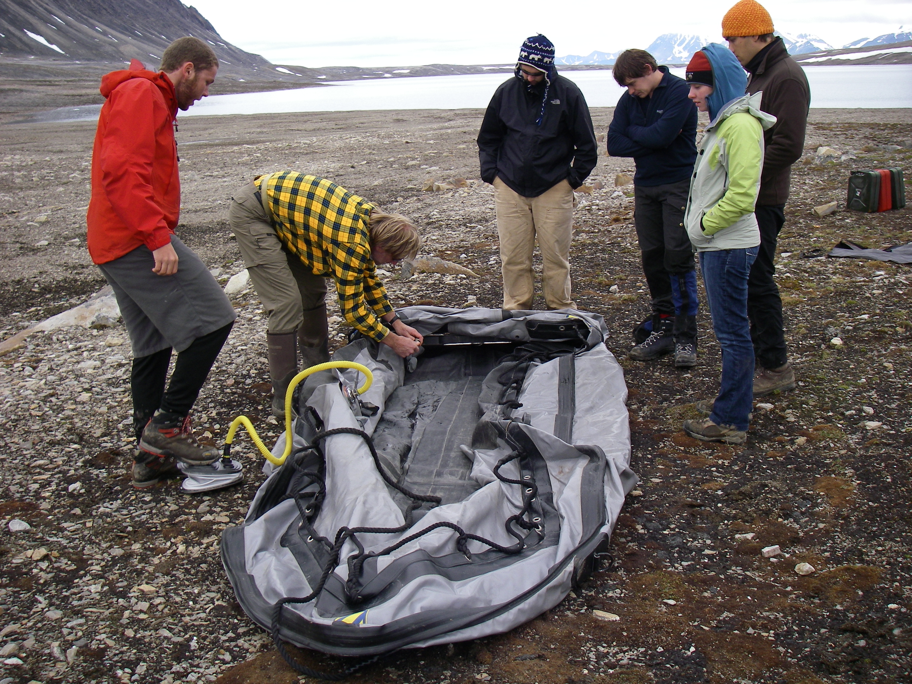 Inflatable boats are used to move across the lake quickly. Kapp Linne, Svalbard, Norway.