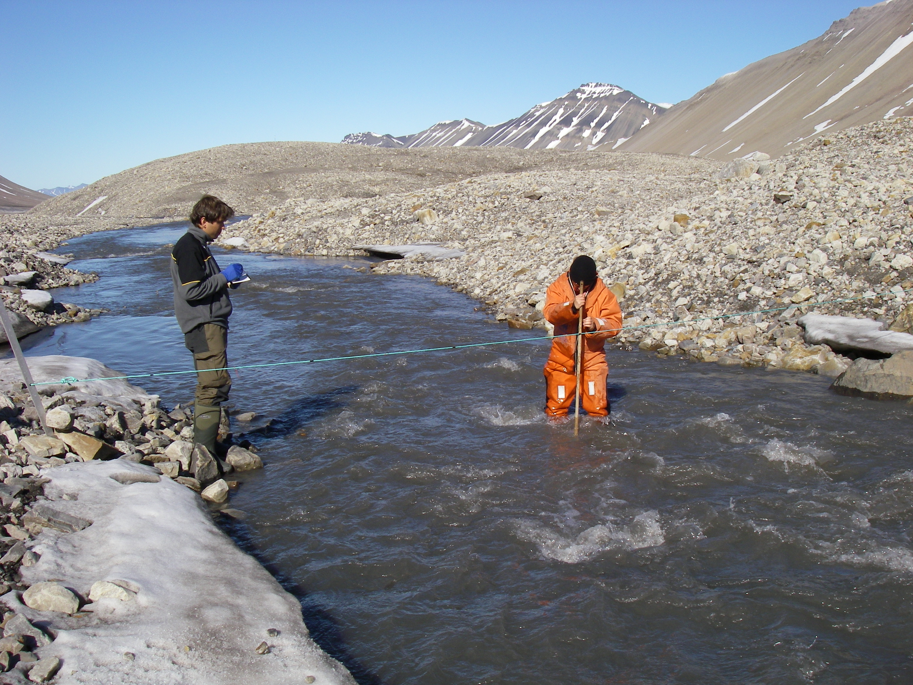 Kristen Mitchell measures discharge near Linne Glacier. Linne Valley, Svalbard, Norway.