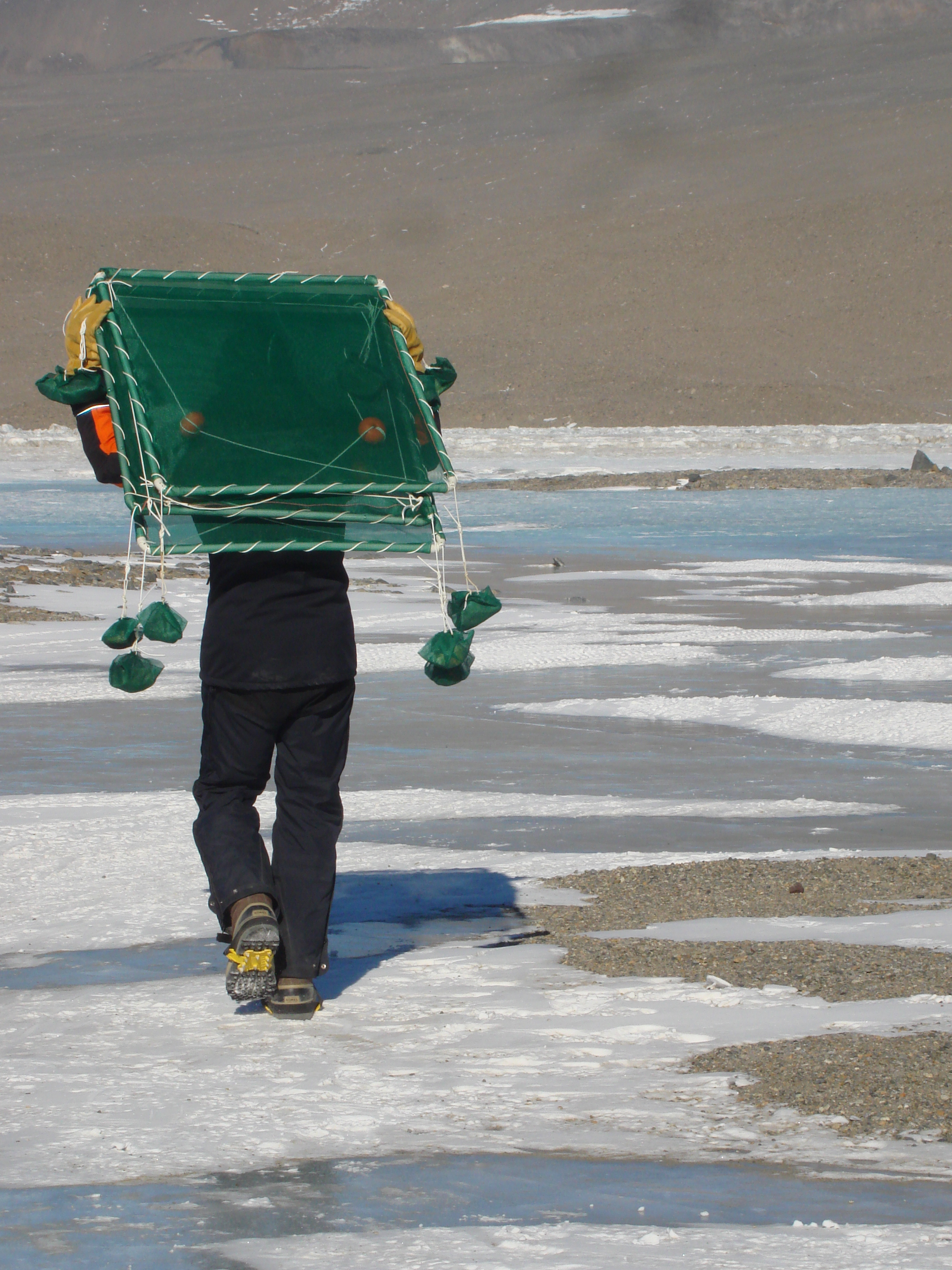 Ian carries the shade screens. Lake Hoare, Dry Valleys, Antarctica.