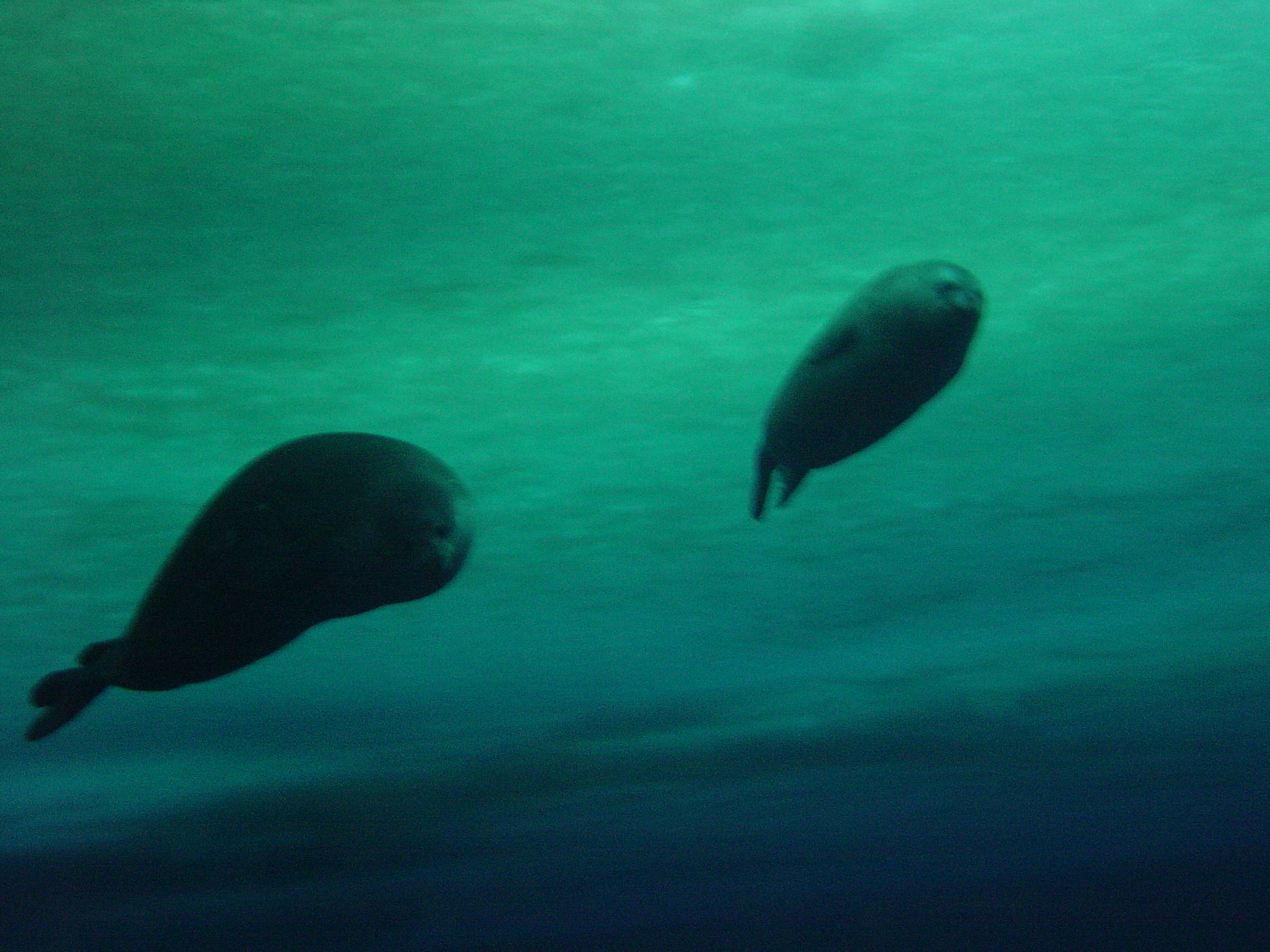 A mother seal and her pup approach the divers. Turtle Rock, Antarctica.