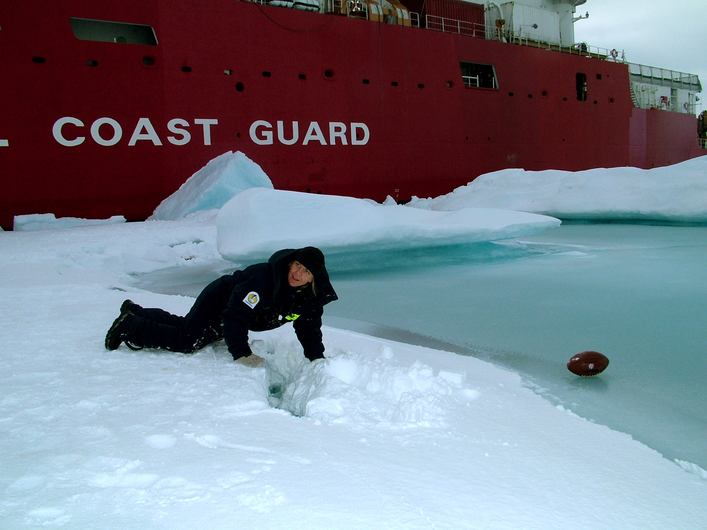 The crew of the USCGC Healy enjoy an ice liberty somewhere on the Arctic Ocean. Retrieving a football from a melt pond.