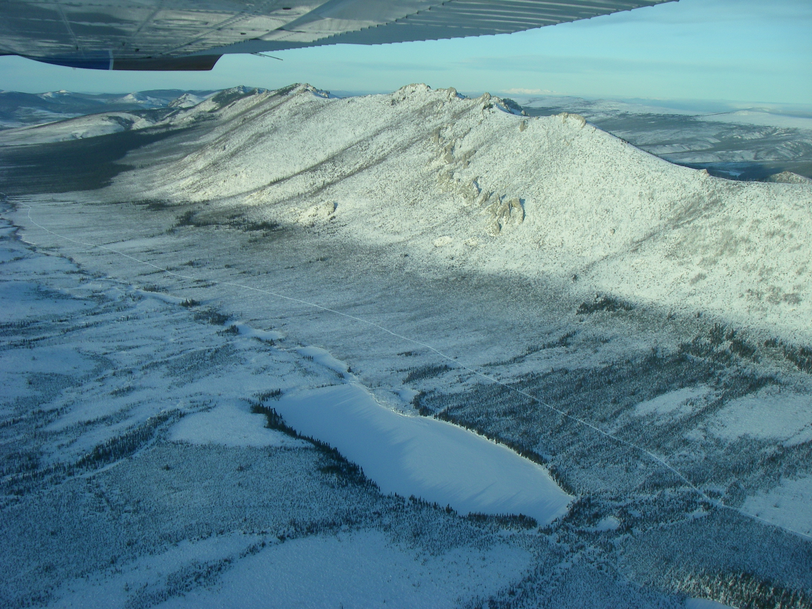 At 9:30am the sun was only high enough to light the top of this mountain ridge. The white patch in the valley is a frozen lake and the straight white line is a snowmobile trail into a vast roadless area. Up in a flight above the White Mountains outside of Fairbanks, Alaska.