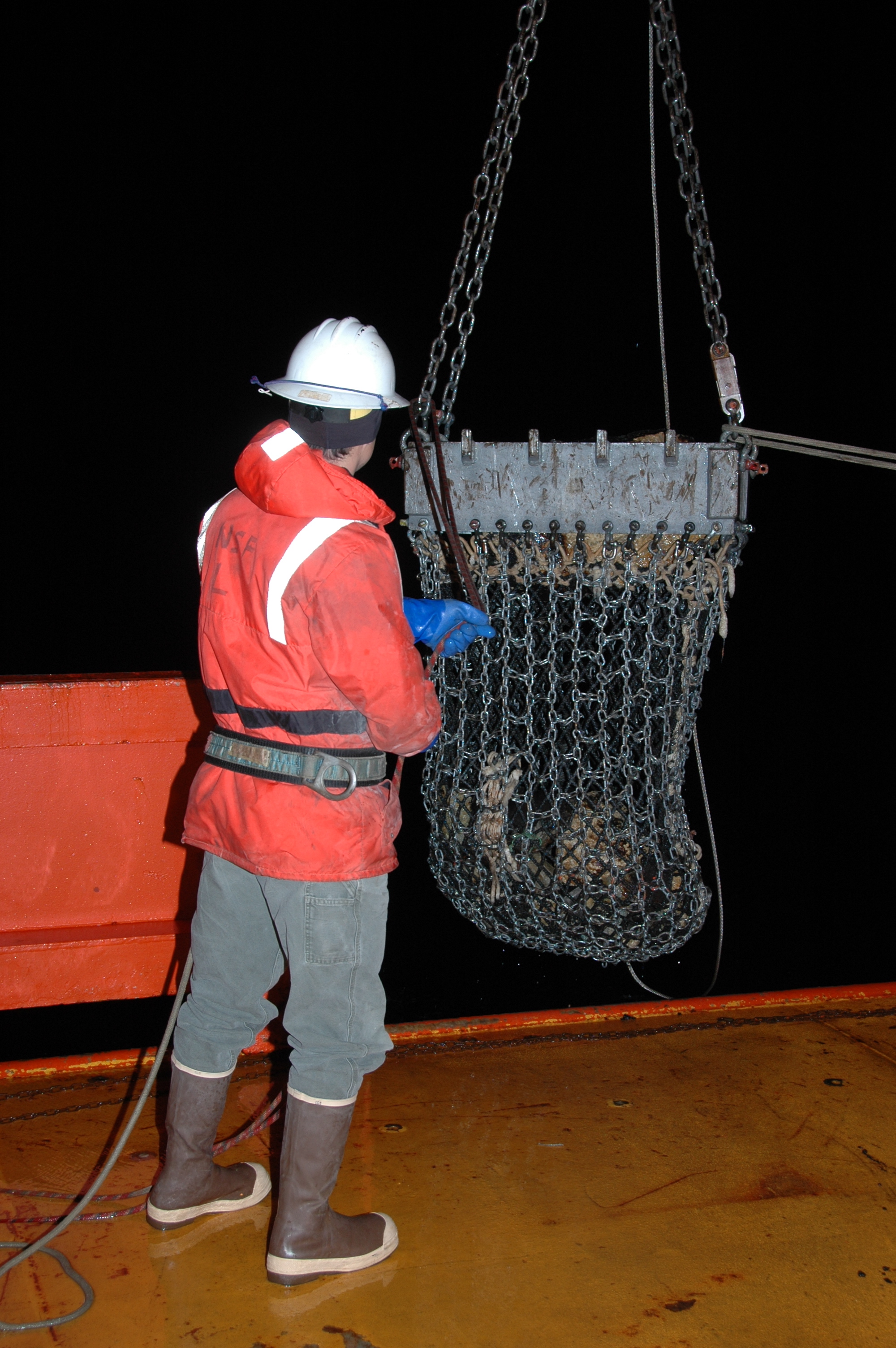 A marine tech guides the rock dredge back up onto the ship from the ocean. Aboard the Nathaniel B. Palmer in the Drake Passage in the South Atlantic Ocean.