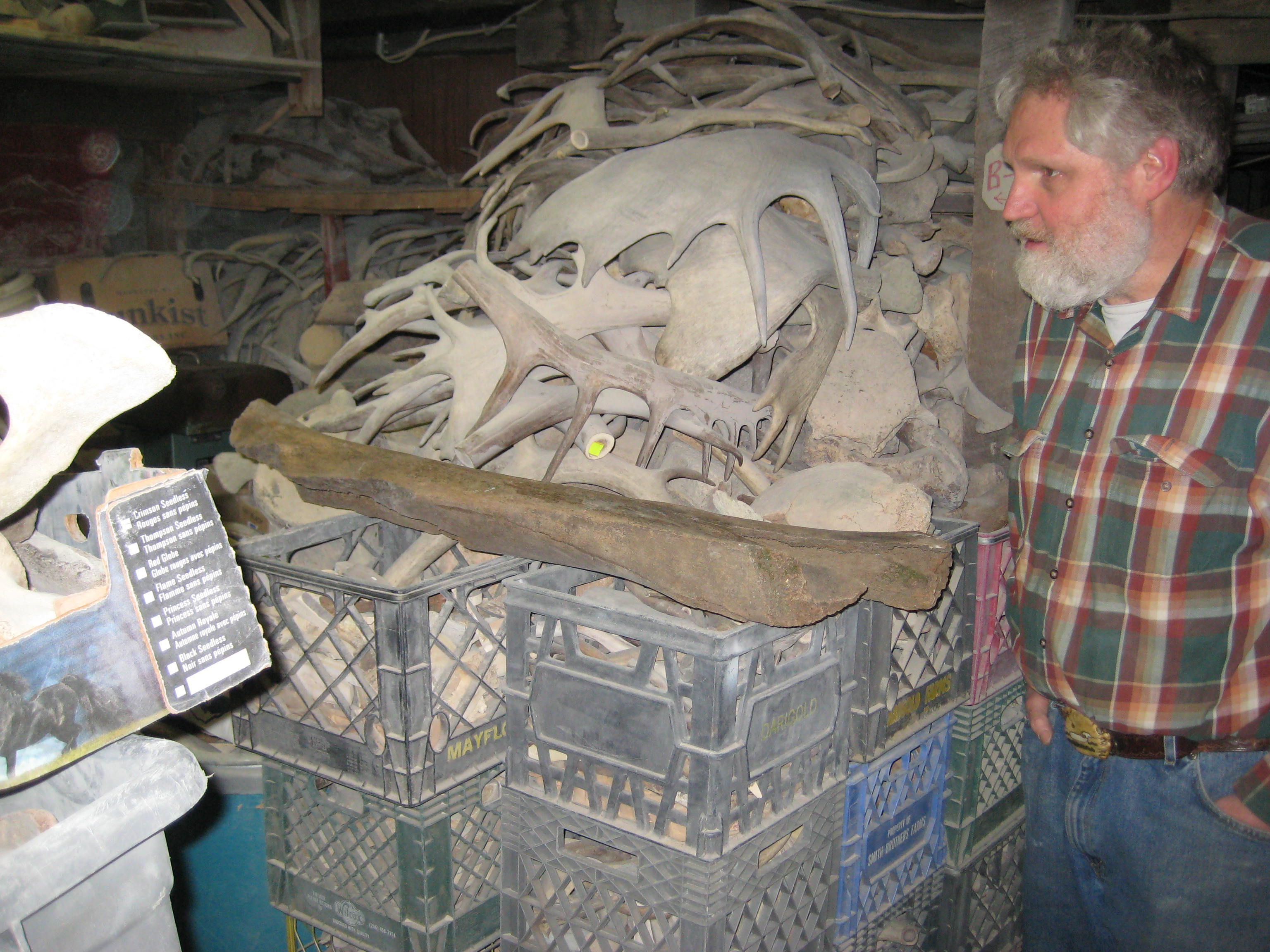 A pile of antlers in the basement of a gift shop on Noble Street in downtown Fairbanks, Alaska. That is a mammoth leg bone in the foreground.
