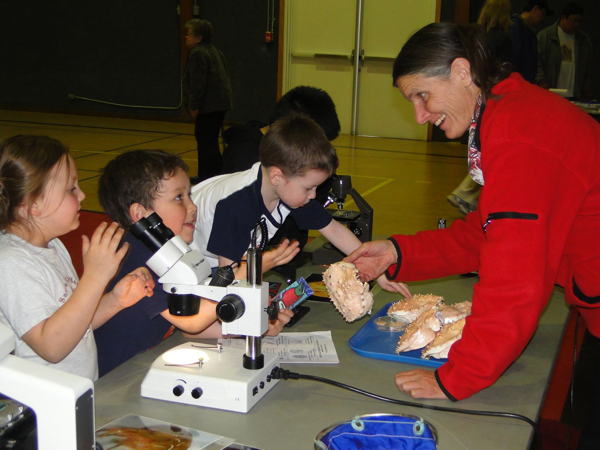 St. George Island Marine Stewardship camp leader Karin Holser shows preschool students the details of a blue king crab carapace. Michelle Ridgway visits St. Pribilof School District for Bering Sea Days festivities on St. Paul Island, Alaska.