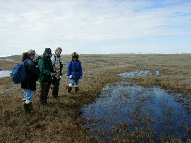 Philip Martin describes the different pond habitat types on the tundra near Barrow to his crew. (LR: Grace Abromatis, Philip Martin, Tim Obritschkewitsch, Michelle from Wiseman who volunteered in 1999)
